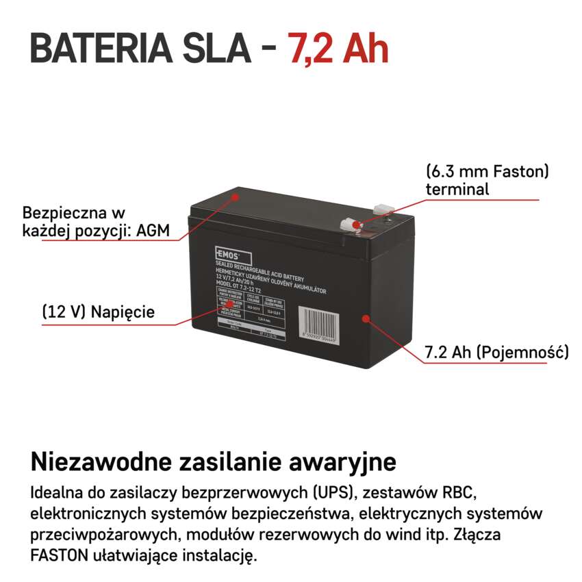 Akumulator EMOS stosuje się, jako rezerwowe źródło zasilania do urządzeń zasilania rezerwowego UPS, zestawów RBC itp. Bezobsługowy akumulator ołowiowy z zaworami regulacyjnymi w wykonaniu AGM umożliwiającym użytkowanie go w dowolnym położeniu. Optymalna żywotność w systemach zasilania rezerwowego wynosi 5 lat.