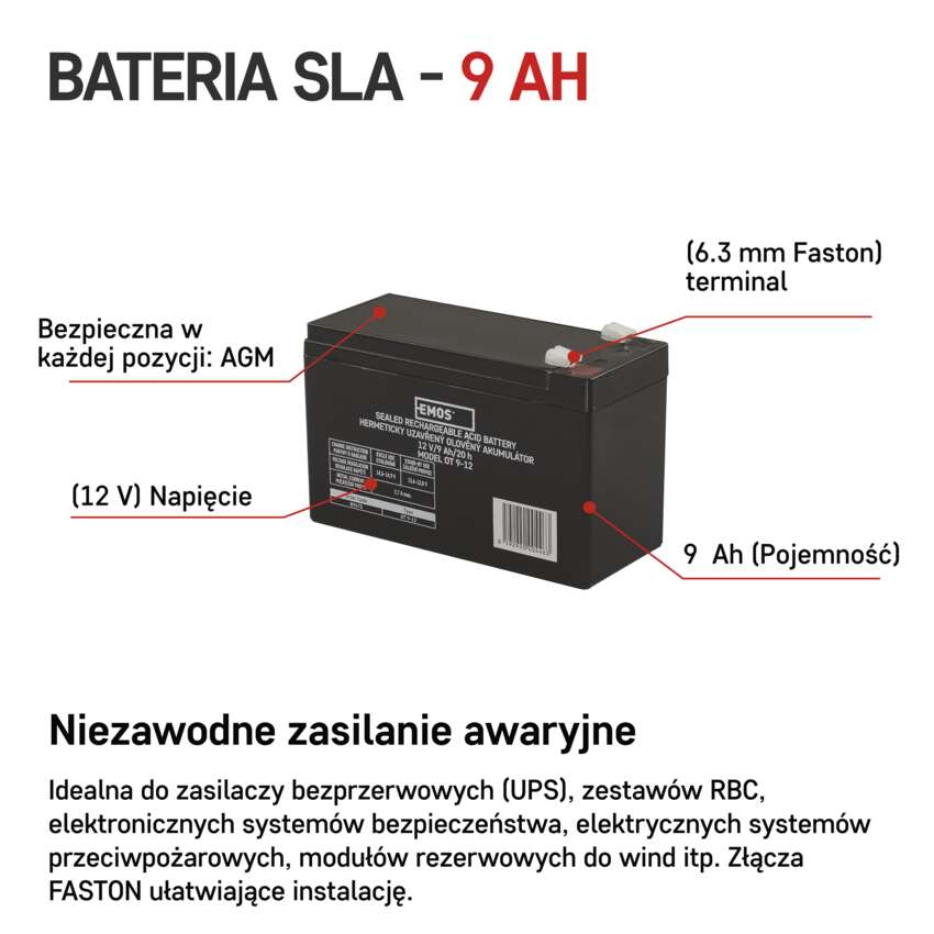 Akumulator EMOS stosuje się, jako rezerwowe źródło zasilania do urządzeń zasilania rezerwowego UPS, zestawów RBC, itp. Bezobsługowy akumulator ołowiowy z zaworami regulacyjnymi w wykonaniu AGM umożliwiającym użytkowanie go w dowolnym położeniu. Optymalna żywotność w systemach zasilania rezerwowego wynosi 5 lat.