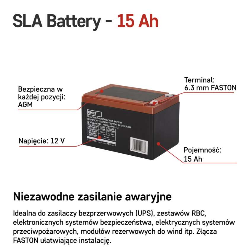 Bezobsługowy akumulator kwasowo-ołowiowa EMOS wyposażony jest w zaciski FASTON. Zaciski FASTON są szeroko stosowane w urządzeniach elektronicznych i elektrycznych oraz w przemyśle motoryzacyjnym. Zaciski FASTON umożliwiają szybkie podłączenie przewodu i złącza do akumulatora.