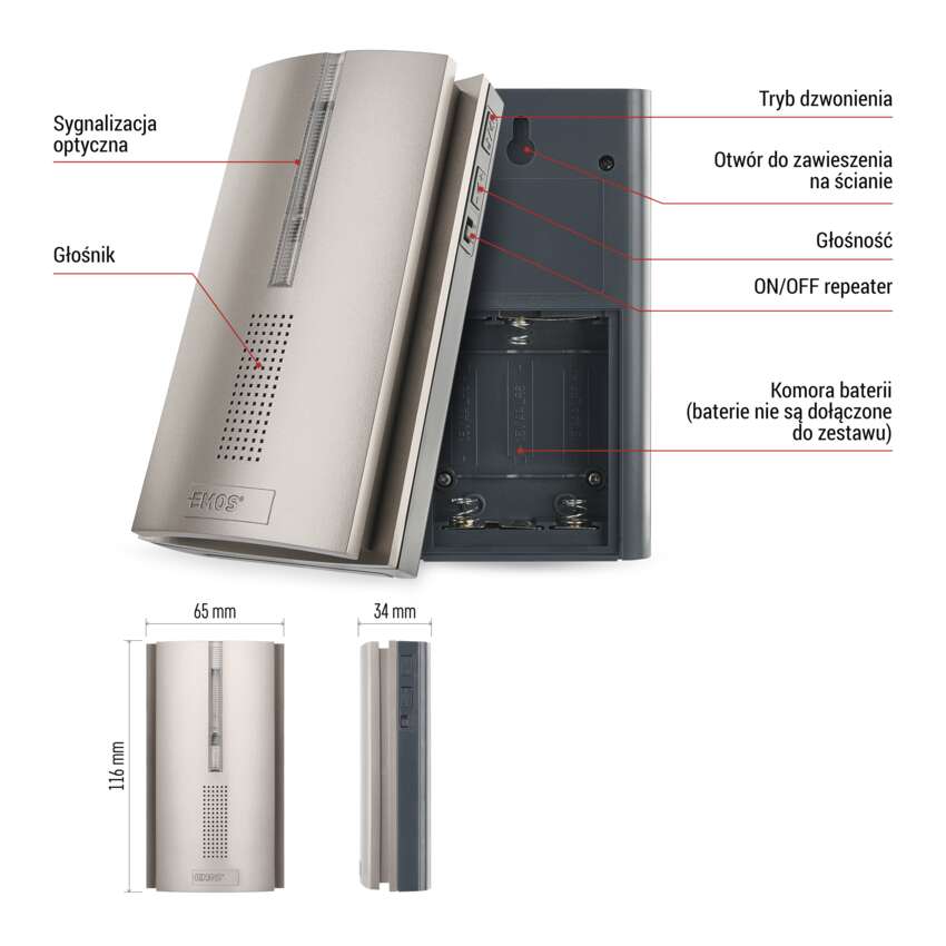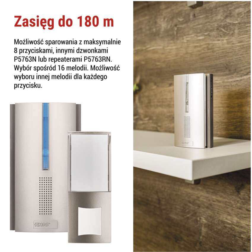EMOS P5763RN odbiera sygnał z przycisku dzwonka (np. P5760T) i powtarza go w tym samym czasie. W ten sposób służy jako repeater, skutecznie rozszerzając zasięg całego systemu dzwonka do drzwi. Można go łączyć z dzwonkami do drzwi z serii EMOS P5760N i P5763N, aby dodać do 8 różnych przycisków.