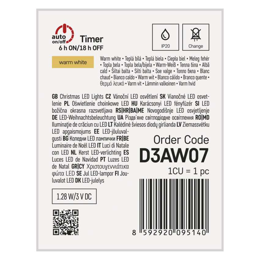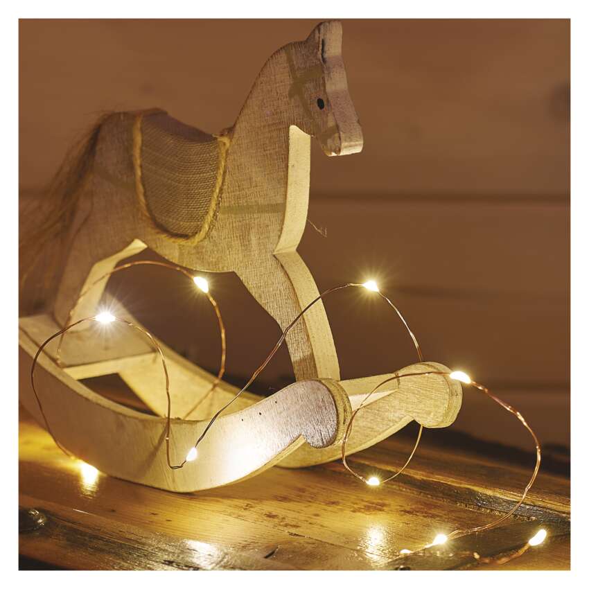 Łańcuchy świąteczne NANO to oczywisty wybór do tworzenia przytulnej atmosfery przy różnych świątecznych okazjach, gdzie nie chcesz, aby ogólne wrażenie dekoracji zostało zakłócone przez przewód zasilający. Dzięki delikatnemu drutowi jasne części łańcucha pięknie się wyróżniają i mogą być wykorzystane do dekoracji różnych części wnętrza, w tym świątecznego stołu. Ultracienki drut można wygiąć do własnych preferencji, a lampki można owinąć wokół wieńca adwentowego lub ulubionej postaci na półce. Łańcuch zapewni również stylową dekorację i przyjemne oświetlenie po włożeniu do słoika lub lampionu. Łańcuch świąteczny NANO wyposażony jest w baterię z włącznikiem i timerem, dzięki czemu po włączeniu łańcuch świeci przez 6 godzin, następnie wyłącza się sam i za 18 godzin znów świeci.