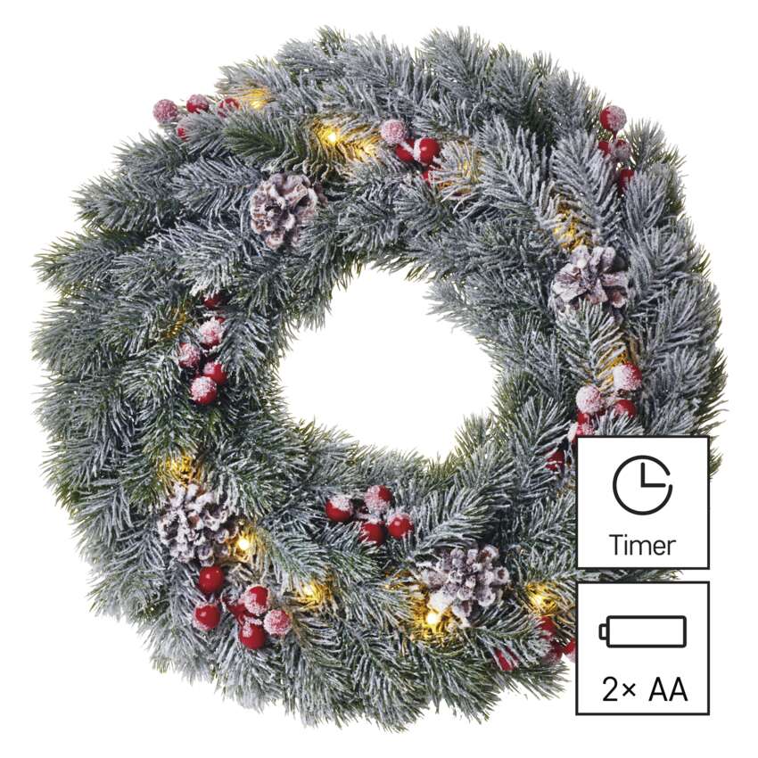 Szukasz gustownego wieńca adwentowego ozdobionego gałązkami, które pozostaną piękne na zawsze i nigdy nie odpadną? W takim razie ośnieżony wieniec adwentowy z gałązkami 3D, które są nie do odróżnienia od prawdziwych jest dla Ciebie. Można go powiesić na drzwiach, ale równie dobrze będzie wyglądał na stole, za oknem, na belce, na drewnianej ścianie lub po prostu umieszczony wewnątrz. A żeby atmosfera była naprawdę doskonała, wieniec wyposażony jest w malutkie lampki LED o ciepłej białej barwie, które zasilane są bateriami AA. Chcesz dekorować swój wianek np. małymi kolbami? Jest to również możliwe. Można z nim pracować jak ze standardową wersją live, dołączając do niego inne dekoracje i stworzyć niepowtarzalną dekorację. Funkcja timera również z pewnością Cię przekona, po jej aktywacji ozdoba powtarzalnie świeci przez 6 godzin, a następnie wyłącza się na 18 godzin.