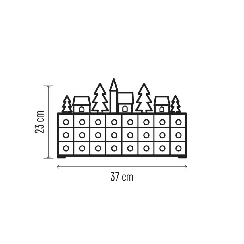 Przygotowania do Adwentu i Świąt Bożego Narodzenia nie mogą obejść się bez popularnego kalendarza adwentowego, który jest szczególnie uwielbiany przez dzieci. Odliczaj ostatnie 24 dni do Wigilii z naszym kalendarzem adwentowym, który charakteryzuje się przyjemnym ciepłym białym światłem. Dzięki zasilaniu bateriami AA możesz go umieścić w dowolnym miejscu w swoim wnętrzu. Wygląda szczególnie dobrze na parapecie okiennym, komodzie lub stoliku telewizyjnym i pomoże Ci dopracować odpowiednią świąteczną atmosferę. Jeśli do każdego dnia kalendarza dodasz drobną słodycz lub prezent, możesz sprawić sobie i swoim dzieciom uroczą codzienną niespodziankę.