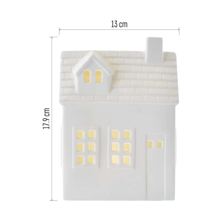 Wnieś magię zimowej bajki do swojego wnętrza. Ten stylowy ceramiczny domek z subtelnym oświetleniem LED w kolorze ciepłej bieli natychmiast przywoła spokojną i ciepłą atmosferę - jakbyś właśnie zajrzał do okna śnieżnej świątecznej opowieści.