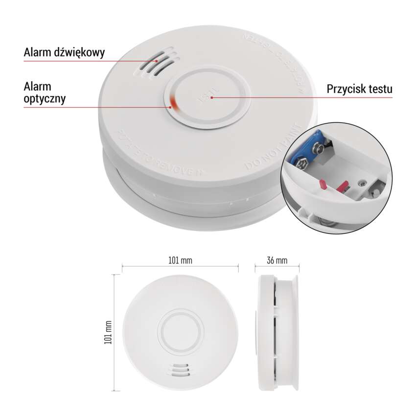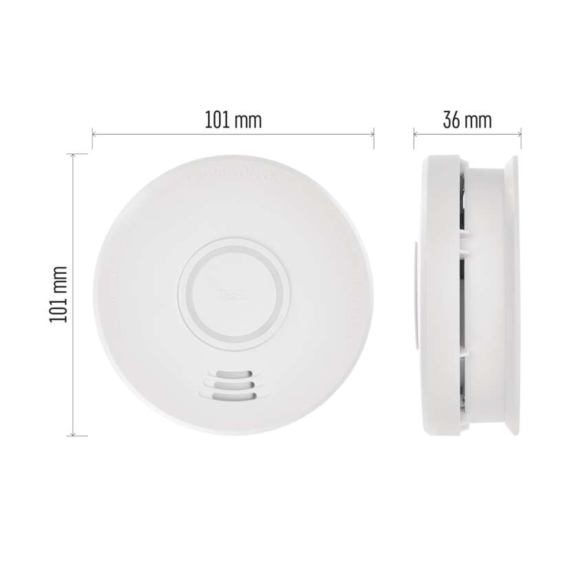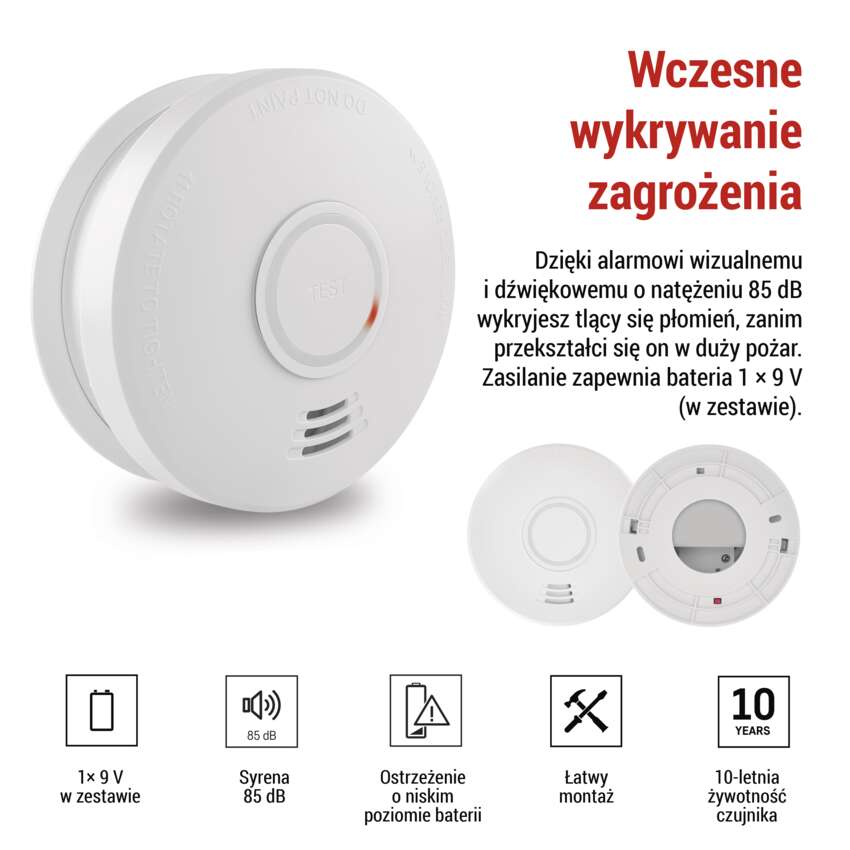 Nasz czujnik dymu został zaprojektowany, aby zapewnić maksymalne bezpieczeństwo i niezawodność. Dzięki alarmom optycznym i dźwiękowym natychmiast ostrzeże Cię o niebezpieczeństwie. Głośny alarm 85 dB jest idealnym wyborem nawet dla większych przestrzeni, zapewniając, że zawsze zostaniesz poinformowany na czas. Czujnik ten charakteryzuje się niskimi kosztami eksploatacji i długą żywotnością czujnika wynoszącą do 10 lat. Nowoczesny i elegancki design pasuje do każdego wnętrza.