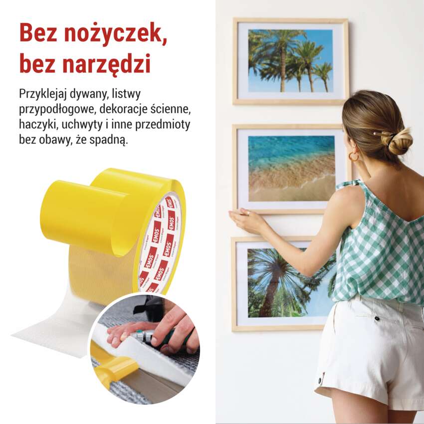 Taśma jest idealna do mocowania dywanów, listew przypodłogowych, dekoracji ściennych, haczyków, uchwytów i innych przedmiotów, które należy bezpiecznie zamocować bez ryzyka przesunięcia lub upadku. Można ją łatwo oderwać ręką, a praca z nią jest szybka i wygodna.