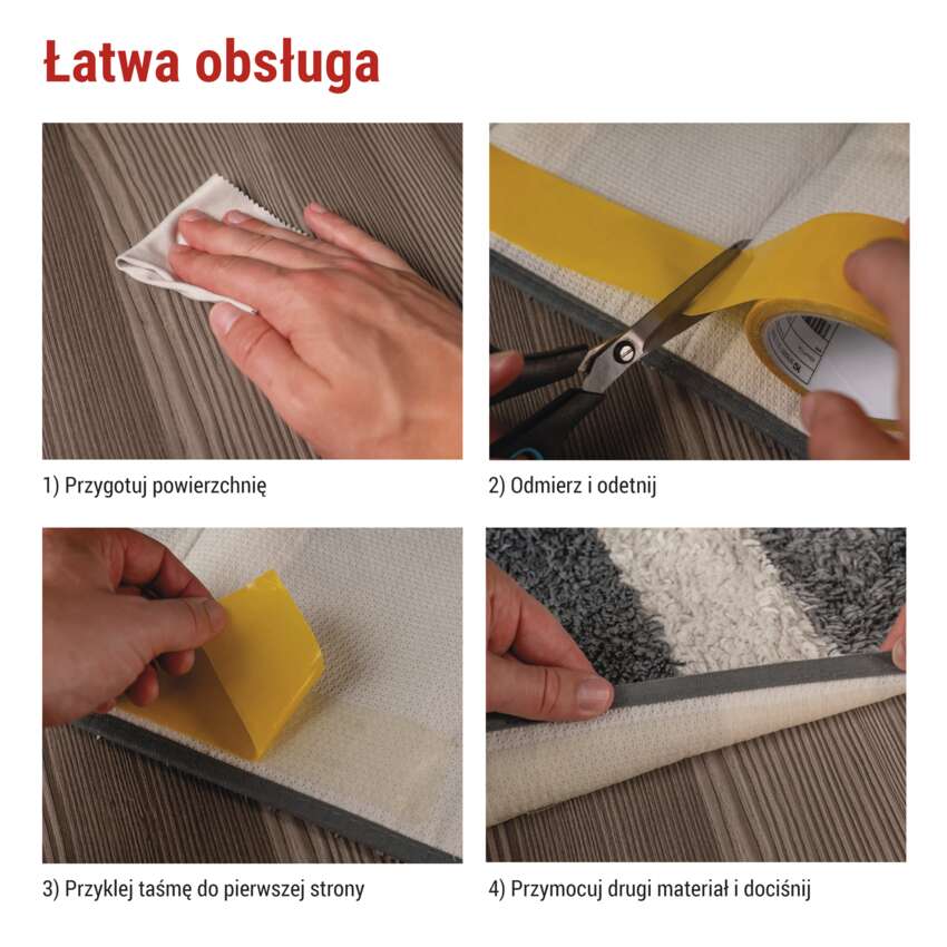 Montaż taśmy jest szybki i naprawdę każdy może go wykonać. Wystarczy przygotować i oczyścić powierzchnię, odmierzyć i odciąć potrzebną długość, przykleić taśmę do pierwszego materiału, a następnie przyłożyć drugą powierzchnię i mocno docisnąć. Bez wiercenia, bez skomplikowanych narzędzi i bez bałaganu – trwałe połączenie gotowe w ciągu kilku chwil.