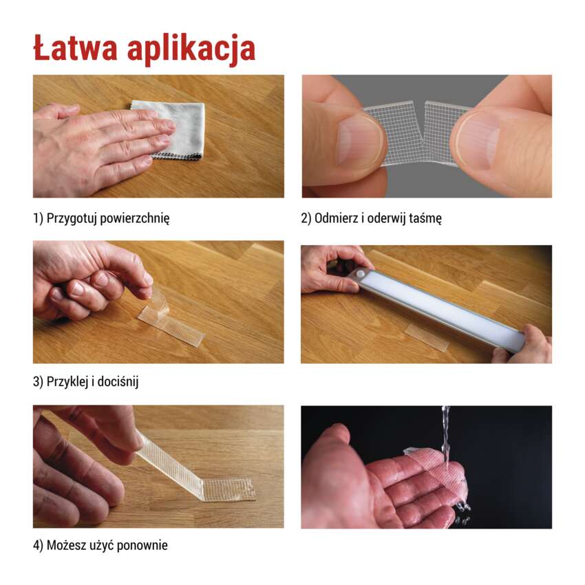 Korzystanie z taśmy dwustronnej NANO jest szybkie i intuicyjne. Wystarczy oczyścić powierzchnię, odmierzyć i oderwać odpowiedni kawałek taśmy, przykleić i mocno docisnąć. W razie potrzeby taśmę można łatwo usunąć, opłukać wodą i ponownie użyć bez utraty przyczepności.