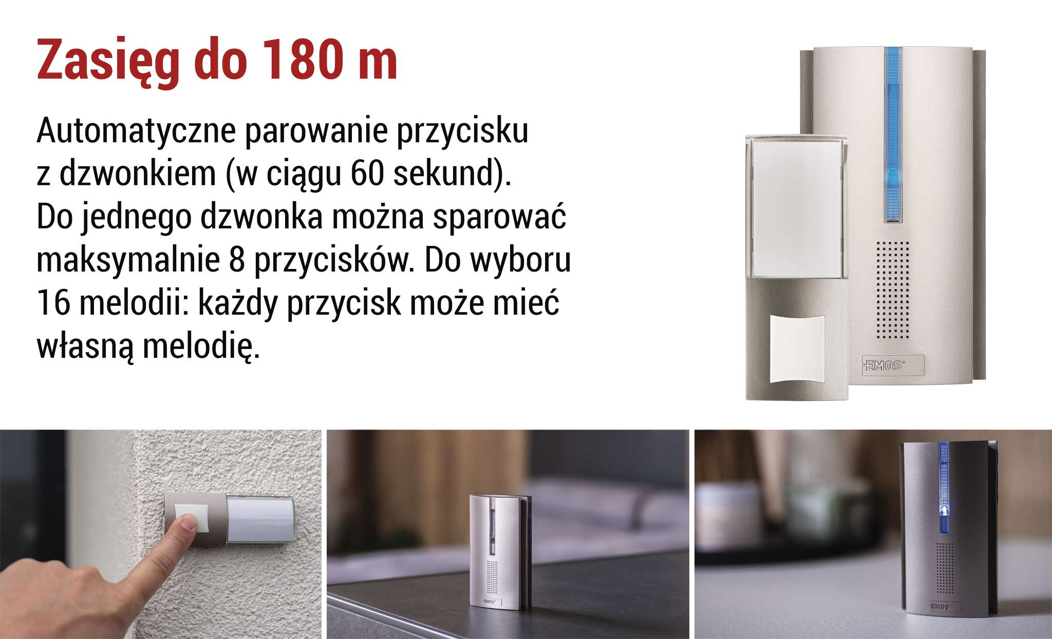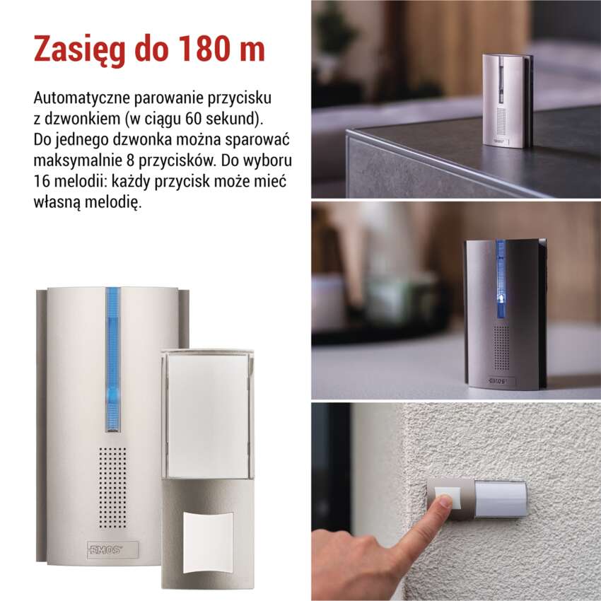 Nowoczesny bezprzewodowy dzwonek do drzwi, który zapewnia połączenie stylowego wzornictwa, bezbłędnych funkcji i technologii, na której można polegać. Dzięki zintegrowanemu wzmacniaczowi sygnału i zasięgowi do 180 metrów, może połączyć dom, ogród, garaż i zdalną bramę - bez kabli, bez kłopotów.