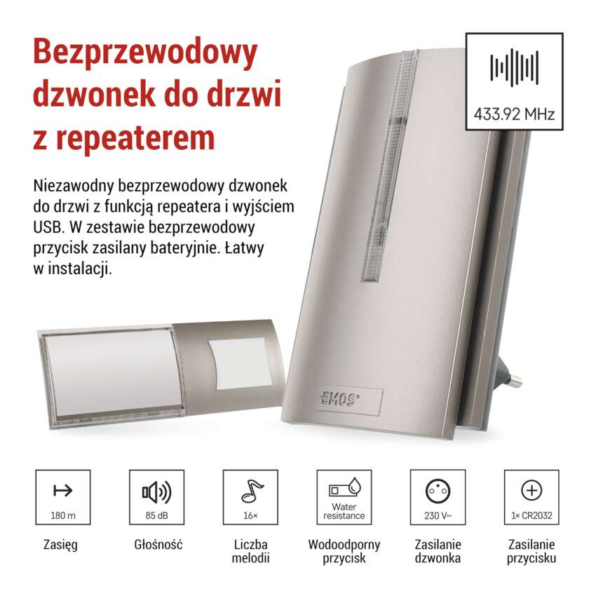 Bezprzewodowy dzwonek do drzwi z funkcją repeatera i wyjściem USB-C