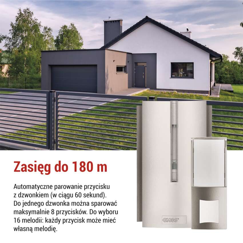 Przycisk dzwonka do drzwi jest zasilany bateryjnie i wodoodporny IP44, dzięki czemu poradzi sobie w niesprzyjających warunkach pogodowych. Bezprzewodowa precyzja przy 433 MHz zapewnia stabilne połączenie do 180 metrów bez konieczności ciągnięcia kabli.