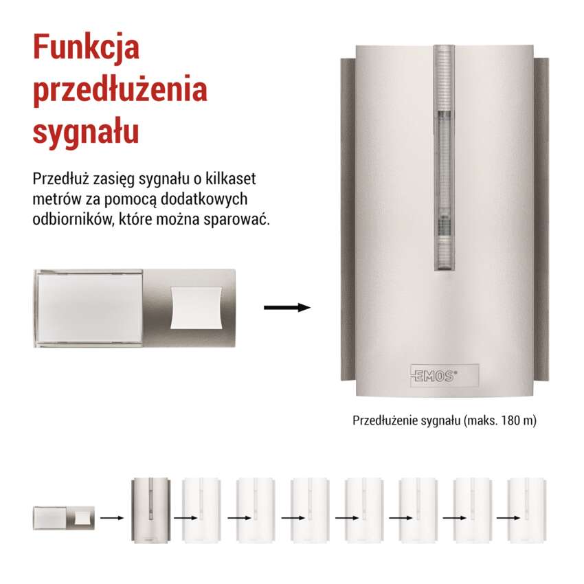 Dzięki zintegrowanej funkcji powtarzania, ten dzwonek do drzwi działa nie tylko jako odbiornik, ale także jako wzmacniacz sygnału, co znacznie zwiększa zasięg przycisku do kilkuset metrów. Idealne rozwiązanie dla większych domów, siedzib firm lub miejsc o trudnym terenie.