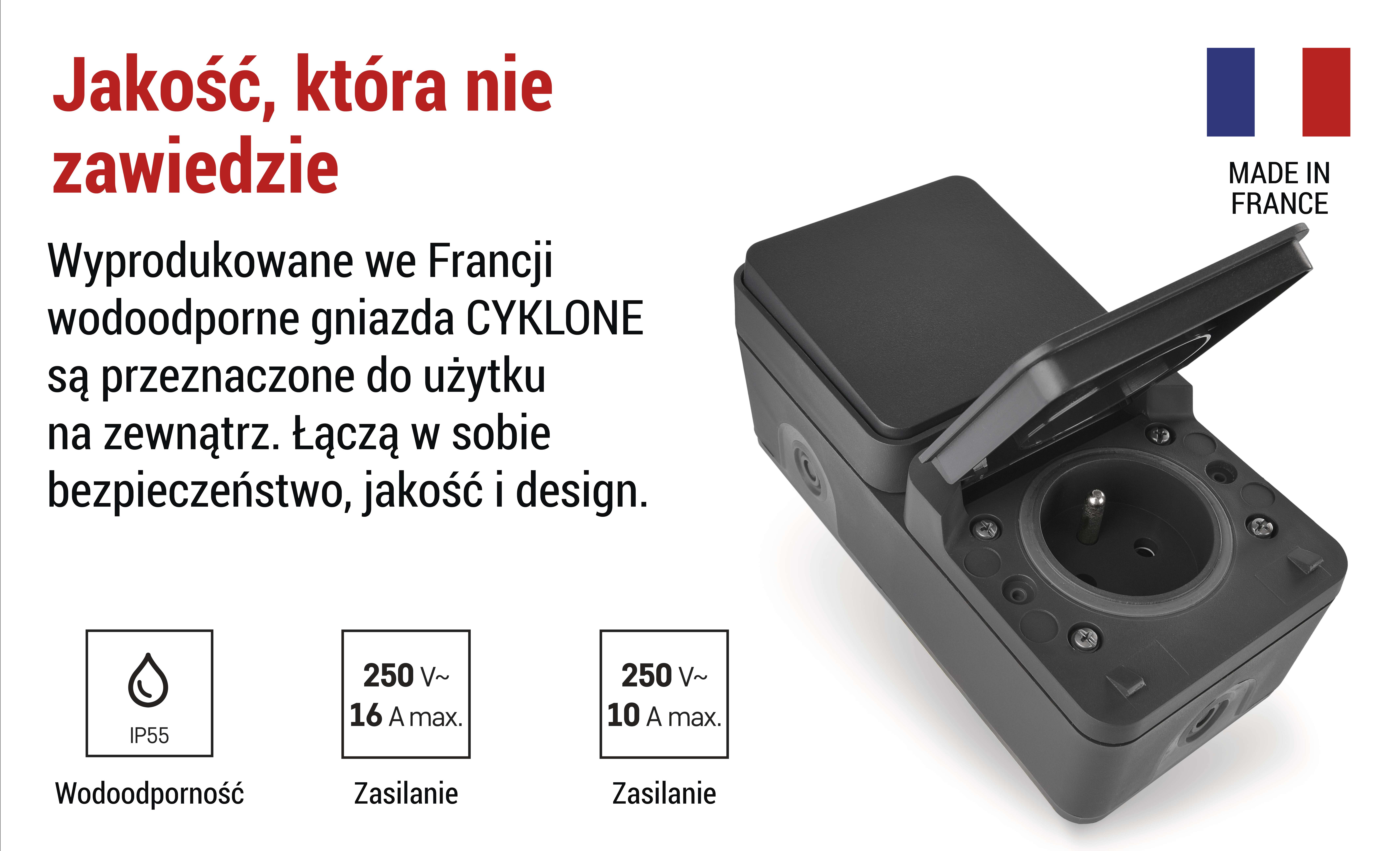 Odkryj nasze wysokiej jakości zewnętrzne gniazda ścienne CYKLONE - idealne rozwiązanie dla bezpiecznego i wygodnego zasilania na tarasach, w ogrodach lub na balkonach. Dzięki odpornemu na warunki atmosferyczne i nowoczesnemu wzornictwu, nasze gniazda zapewniają łatwy dostęp do energii elektrycznej na zewnątrz, niezależnie od tego, czy potrzebujesz zasilania świateł, elektronarzędzi czy dekoracji.