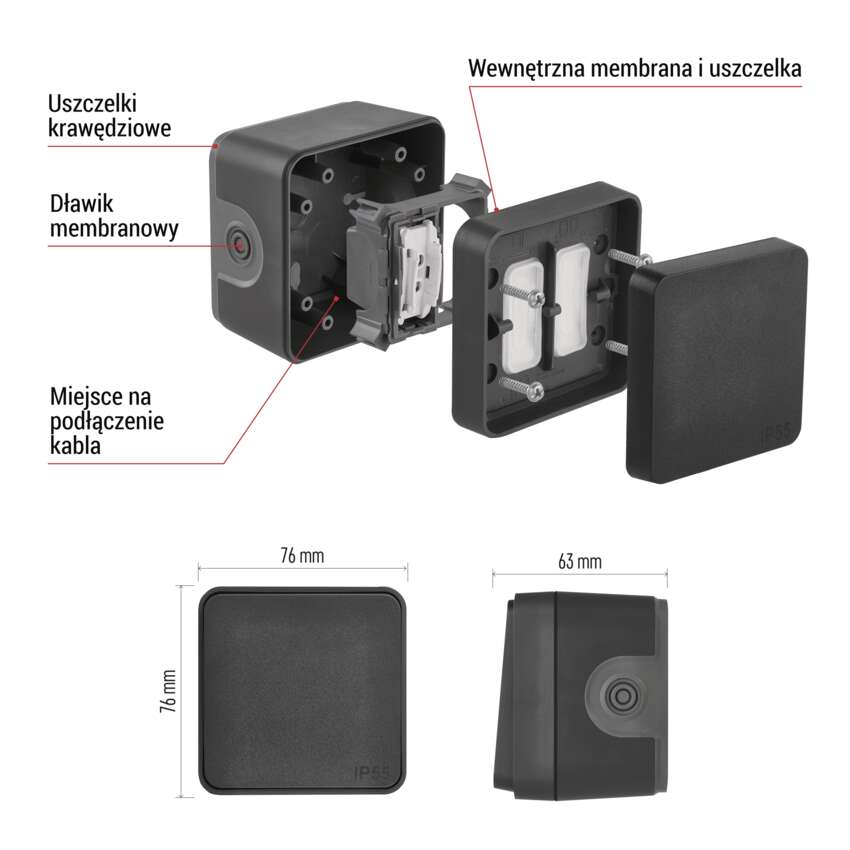 Montaż poziomy i pionowy. Elastyczne uszczelnienie chroni przed niepożądanym wpływem środowiska. Przepust kablowy umożliwia łatwe podłączenie kabla lub tulei, zapewniając uniwersalność dla każdego rodzaju instalacji.