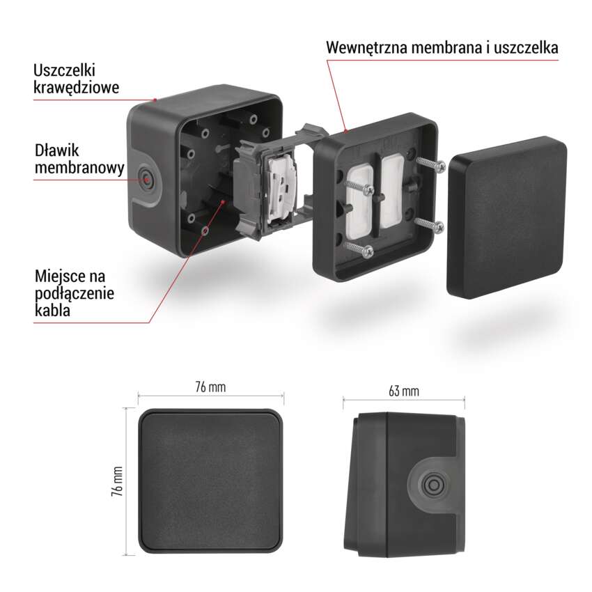 Montaż poziomy i pionowy. Elastyczna uszczelka chroni przed niepożądanym wpływem środowiska. Przepust kablowy umożliwia łatwe podłączenie kabla lub tulei, zapewniając uniwersalność dla każdego rodzaju instalacji.