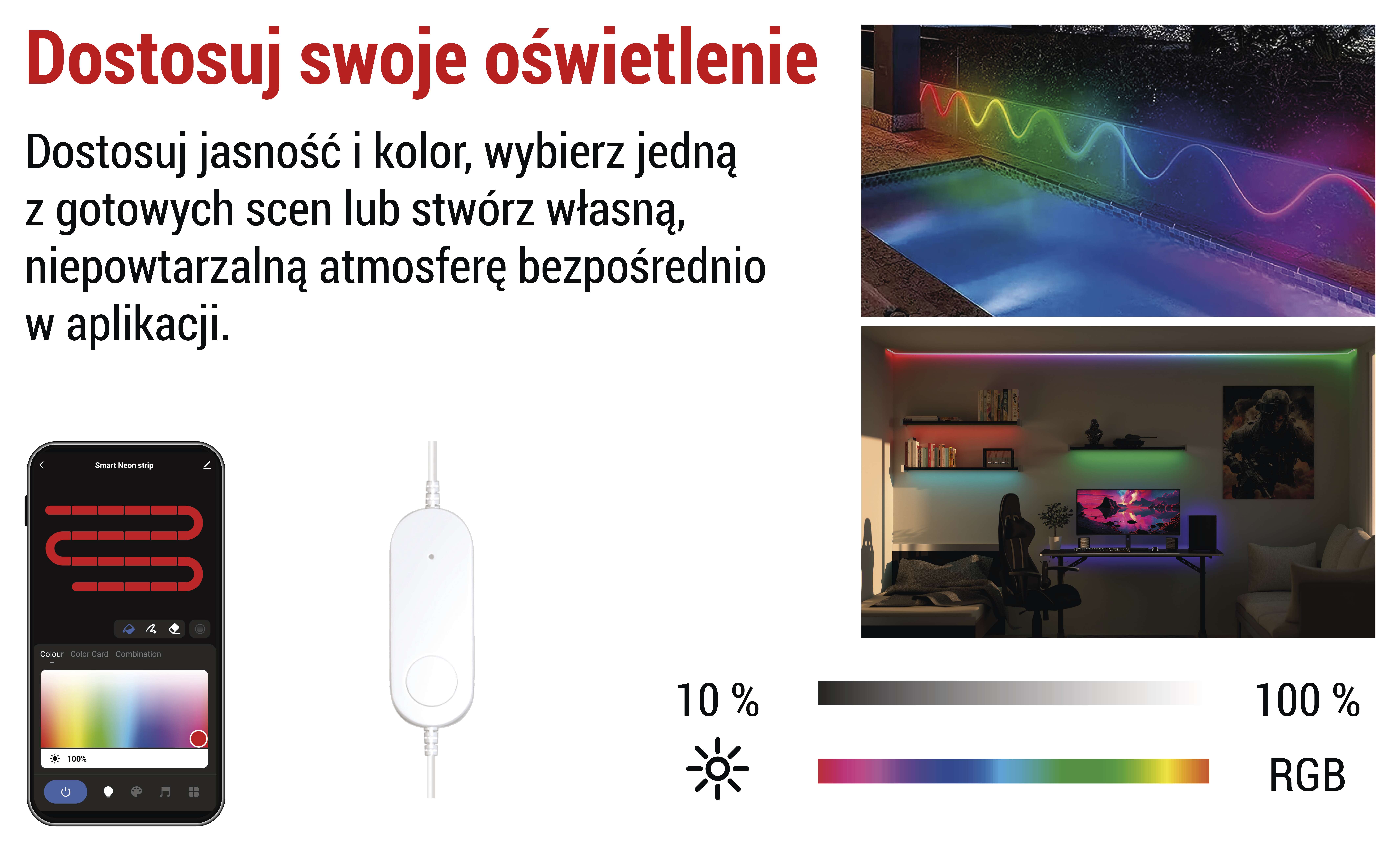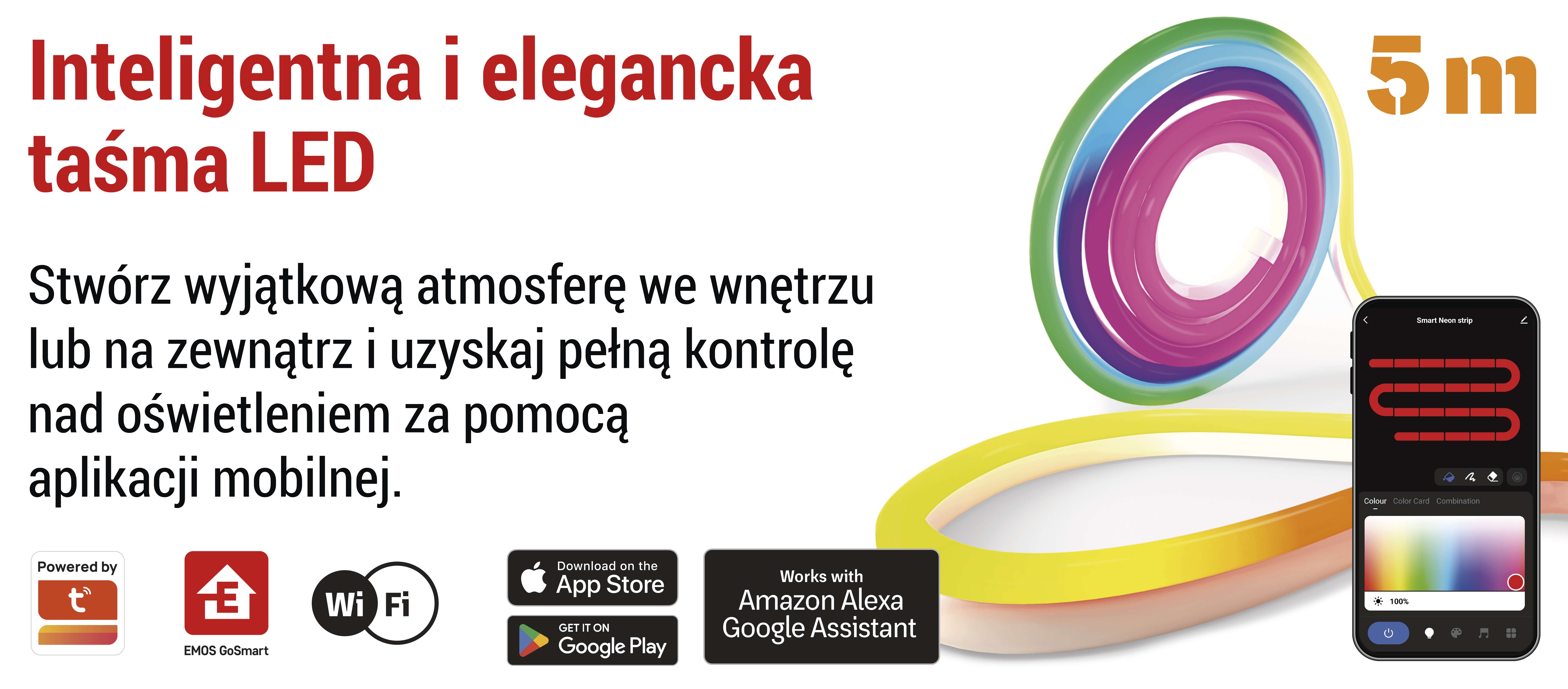 Odkryj magię oświetlenia dzięki naszej elastycznej taśmie LED NEON! Ta 5-metrowa taśma RGBIC z ponad 16 milionami kolorów oferuje segmentowaną kontrolę kolorów i jest w pełni kontrolowana za pomocą darmowej aplikacji EMOS GoSmart, dostępnej zarówno dla systemu Android, jak i iOS. Ustaw kolory, jasność i oświetlenie według własnych upodobań, pozwól paskowi reagować na muzykę, użyj ustawień wstępnych lub niestandardowych trybów oświetlenia, twórz sceny i automatyzacje. Pełen funkcji pasek LED NEON tworzy atmosferę, która idealnie pasuje do Twojego stylu!