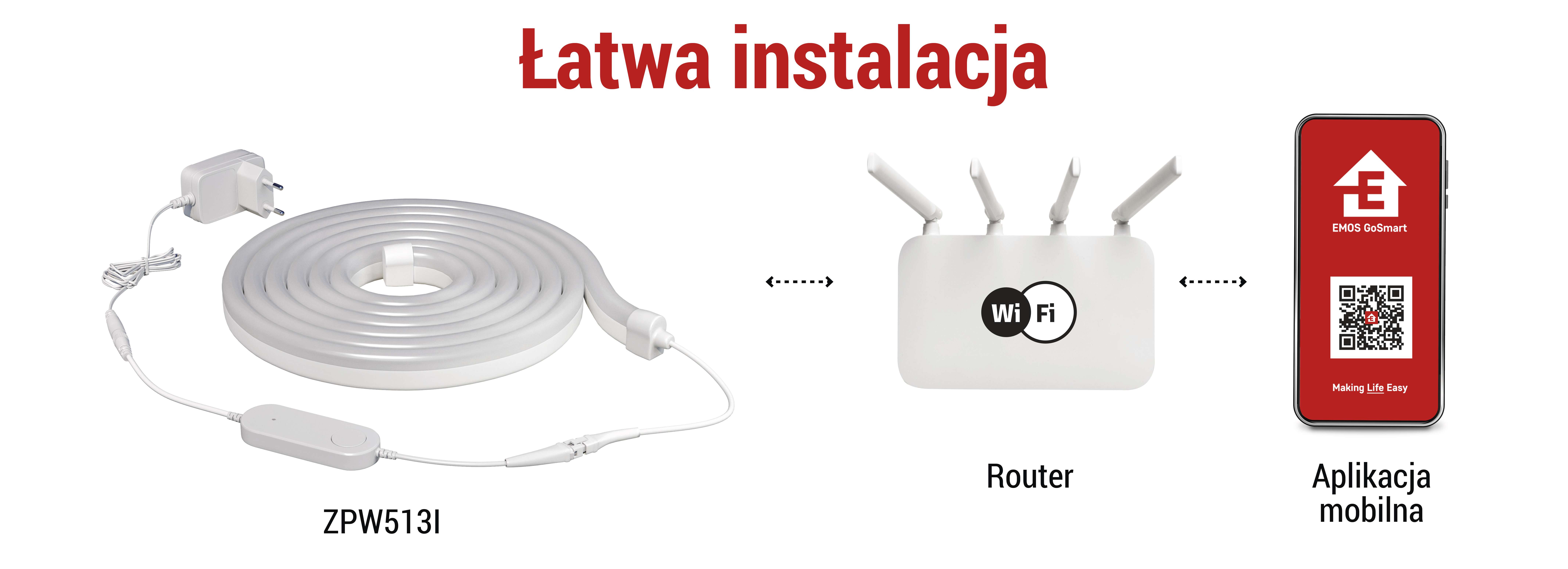 Łatwy montaż zapewniają uchwyty, które można przymocować za pomocą taśmy 3M (w zestawie) lub śruby (brak w zestawie). Wystarczy wygiąć pasek do pożądanego kształtu, podłączyć go do sieci Wi-Fi sparować go z aplikacją mobilną i kolorowa zabawa może się rozpocząć.