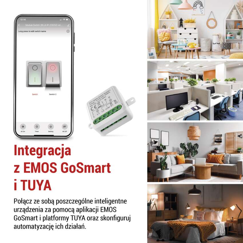 Inteligentny moduł można połączyć z innymi urządzeniami w domu (zegary, światła, czujniki drzwi, okien, ogrzewania). Po sparowaniu z aplikacją mobilną EMOS GoSmart można automatyzować i planować czasy dla poszczególnych urządzeń. Na przykład automatycznie włączać światła podczas wakacji. Stwórz inteligentny dom, który dostosowuje się do Twoich potrzeb.