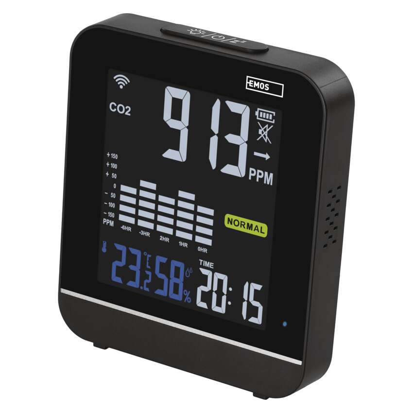 Monitor jakości powietrza Gosmart posiada mnóstwo przydatnych funkcji. Dzięki wyraźnemu wyświetlaczowi LED, który jest stale podświetlany, można uzyskać informacje o aktualnym stanie CO2 za pomocą trzech różnych poziomów kolorów. Wyświetlacz wyraźnie pokazuje również aktualny czas, temperaturę i wilgotność w monitorowanym pomieszczeniu. W aplikacji EMOS GoSmart będziesz mieć przegląd minimalnych i maksymalnych wartości monitorowanych wskaźników. I bonus na koniec! Dzięki wyświetlaczowi zegara może być również używany jako budzik.
