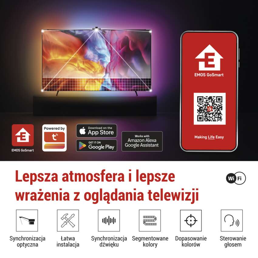 Podświetlenie telewizora GoSmart Ambilight LED RGB przenosi wrażenia z oglądania telewizji na zupełnie nowy poziom. Dzięki kamerze synchronizującej HD, podświetlenie automatycznie dostosowuje się do kolorów na ekranie, tworząc idealny efekt wizualny. Cała kontrola i ustawienia są dokonywane za pośrednictwem aplikacji mobilnej EMOS GoSmart, która jest dostępna zarówno dla systemu Android, jak i iOS.
