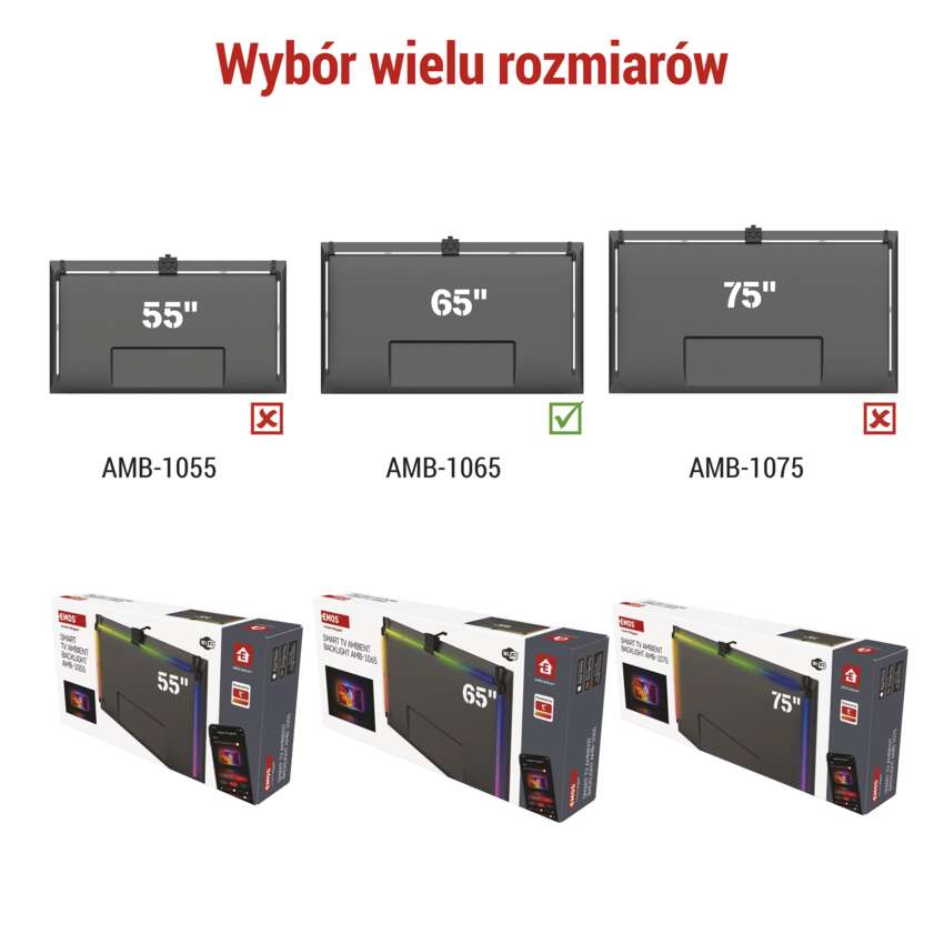 Podświetlenie telewizora GoSmart Ambilight LED RGB przenosi wrażenia z oglądania telewizji na zupełnie nowy poziom. Dzięki kamerze synchronizującej HD, podświetlenie automatycznie dostosowuje się do kolorów na ekranie, tworząc idealny efekt wizualny. Cała kontrola i ustawienia są dokonywane za pośrednictwem aplikacji mobilnej EMOS GoSmart, która jest dostępna zarówno dla systemu Android, jak i iOS.