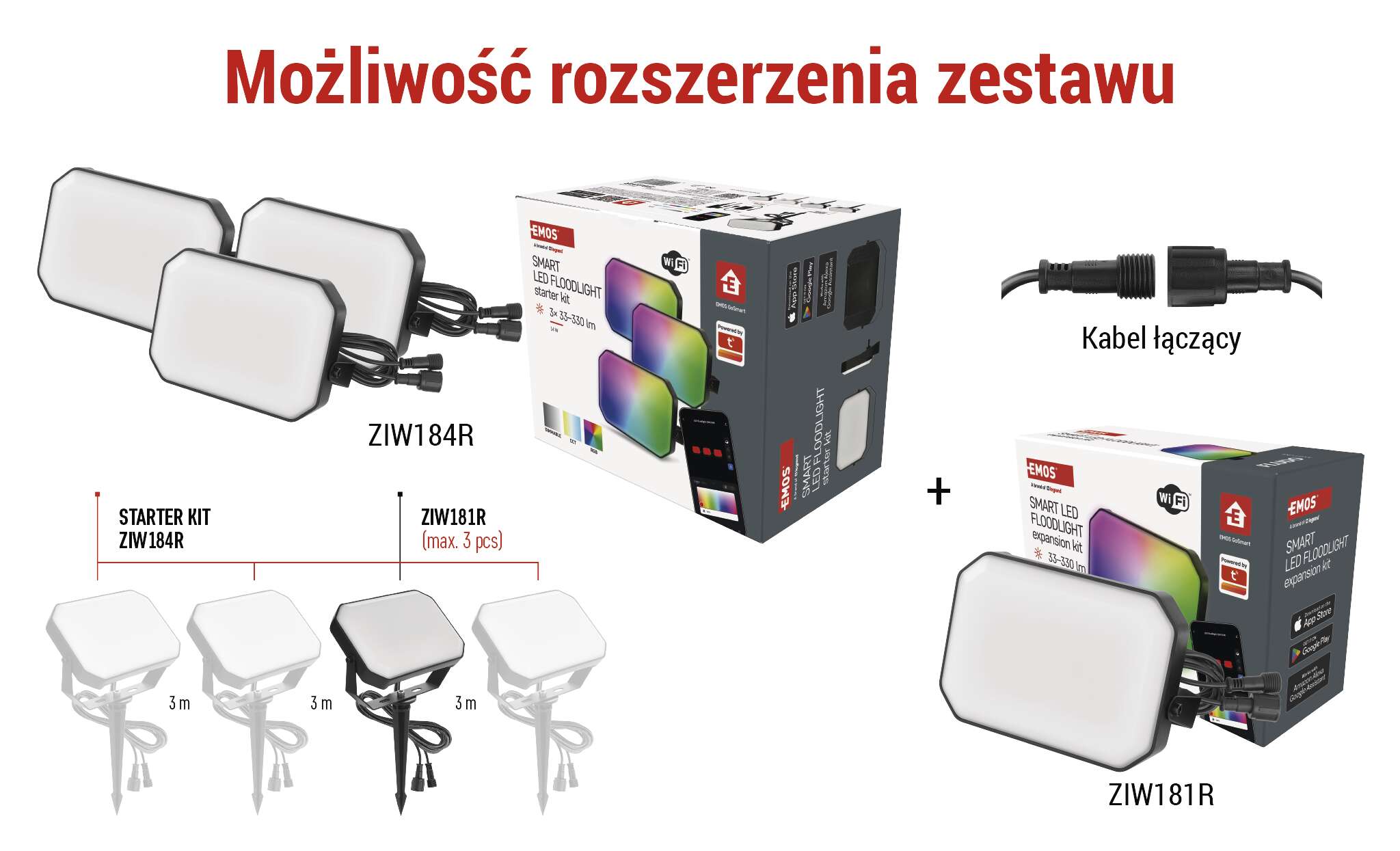 Ten zestaw rozszerzający zawiera 1 sztukę reflektora GoSmart, który jest przeznaczony do rozbudowy zestawu startowego ZIW184R. Pozwala on zwiększyć łączną liczbę reflektorów do 6 - przy użyciu do 3 zestawów rozszerzających wraz z jednym zestawem startowym. System oferuje zatem szerokie możliwości dostosowywania i rozmieszczania reflektorów zgodnie z własnymi pomysłami i możliwościami przestrzennymi, niezależnie od tego, czy chcesz oświetlić fasadę, altanę ogrodową czy zorganizować przyjęcie w ogrodzie. Odległość między poszczególnymi reflektorami wynosi do 3 m.