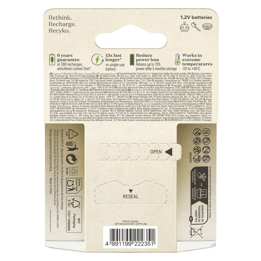 GP nie skupia się wyłącznie na wytwarzaniu wysokiej klasy produktów, ale aktywnie poszukuje sposobów na zmniejszenie wpływu swoich produktów i ich opakowań na środowisko. Przykładem takich działań jest innowacyjna linia akumulatorów i ładowarek o nazwie Recyko. Produkty te są pakowane w papierowe opakowania, które nie zawierają tworzyw sztucznych. Promuje to wykorzystanie materiałów pochodzących z recyklingu i zmniejsza ilość odpadów. Dzięki tym przyjaznym dla planety opakowaniom Ty również możesz stać się częścią pozytywnych zmian! Przyczyń się do zmniejszenia obciążenia dla środowiska.
