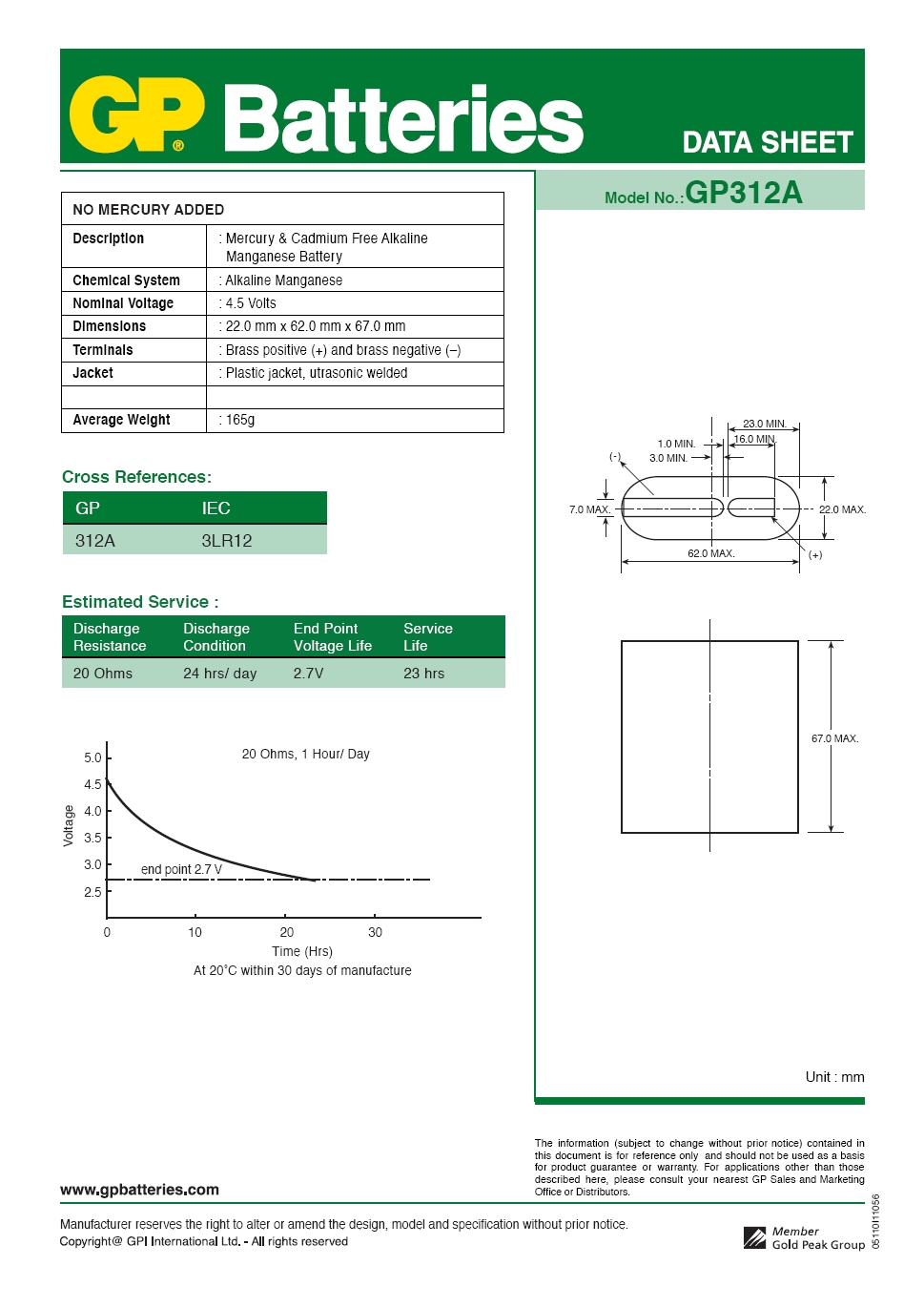 | rodzaj | 3LR12 4,5 V (płaska) |