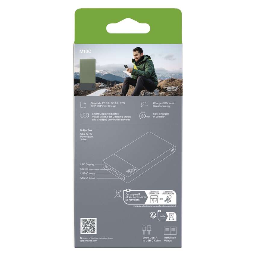 Z naszym powerbankiem GP możesz wygodnie ładować wszystkie swoje urządzenia, od smartwatchy, słuchawek bezprzewodowych, tabletów po telefony komórkowe. Dzięki trzem portom USB (1× USB-A i 2× USB-C) możesz ładować do trzech urządzeń jednocześnie.