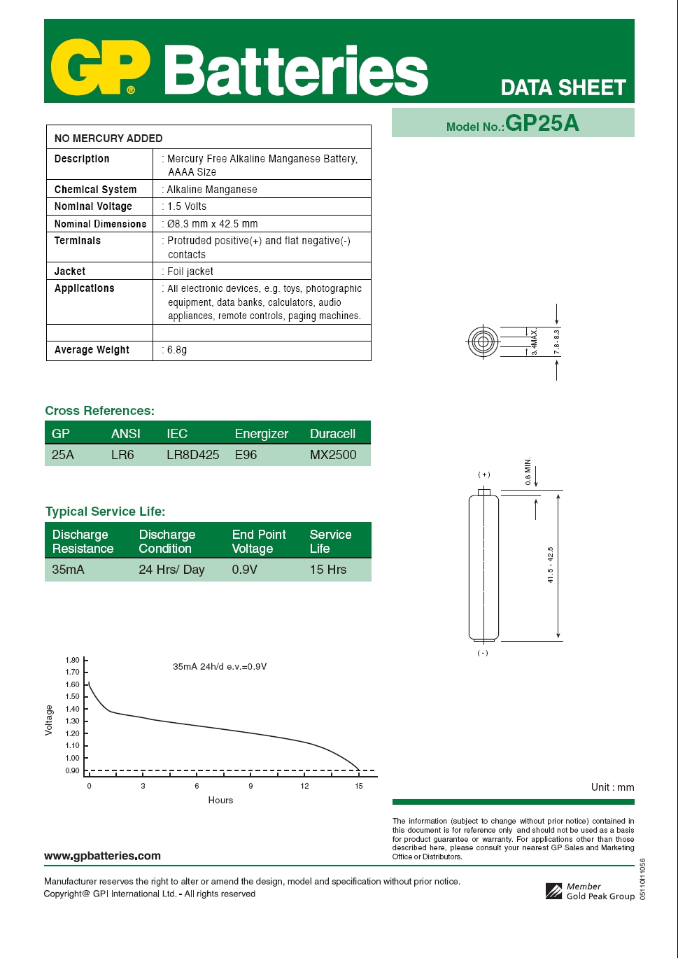 | rodzaj | GP 25A (AAAA, LR61, LR8, MN2500) |