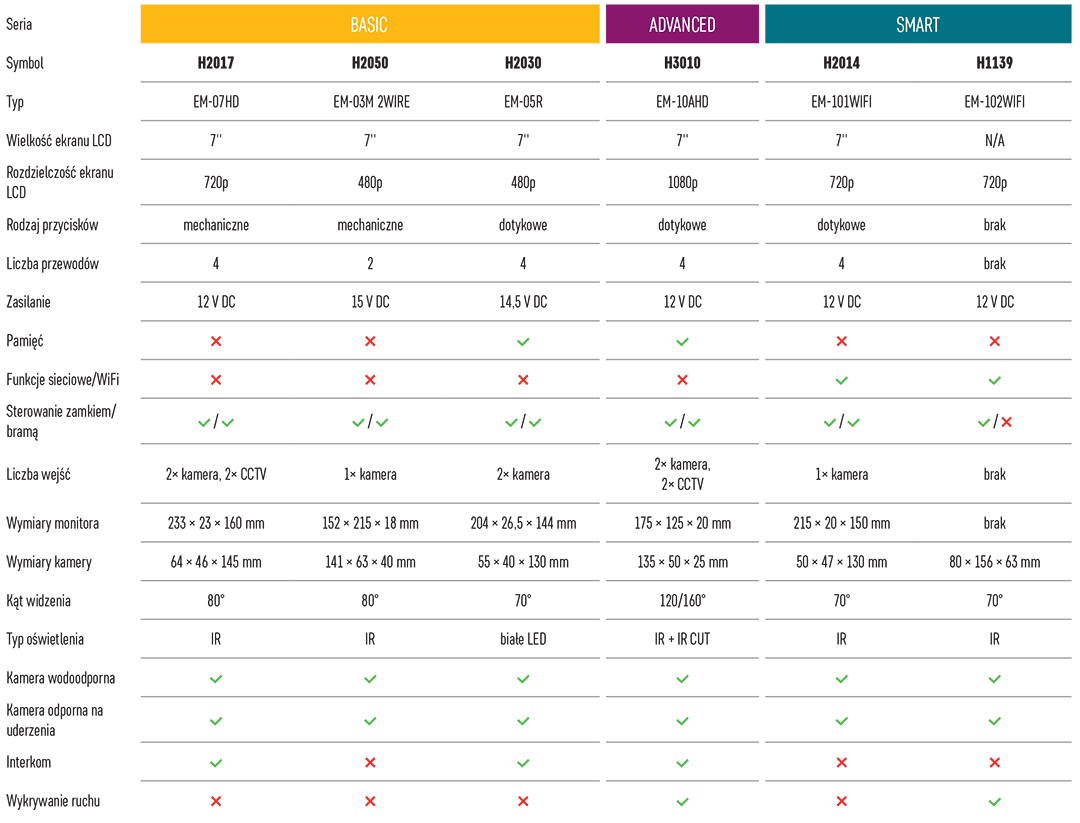 Wspólną cechą wideofonów serii BASIC, ADVANCED i SMART jest monitor LCD 7″ umieszczony w budynku. W przypadku serii BASIC można korzystać z rozdzielczości 480p lub 720p, seria ADVANCED dysponuje wysoką rozdzielczością 1080p, a modele serii SMART oferują rozdzielczość 720p.