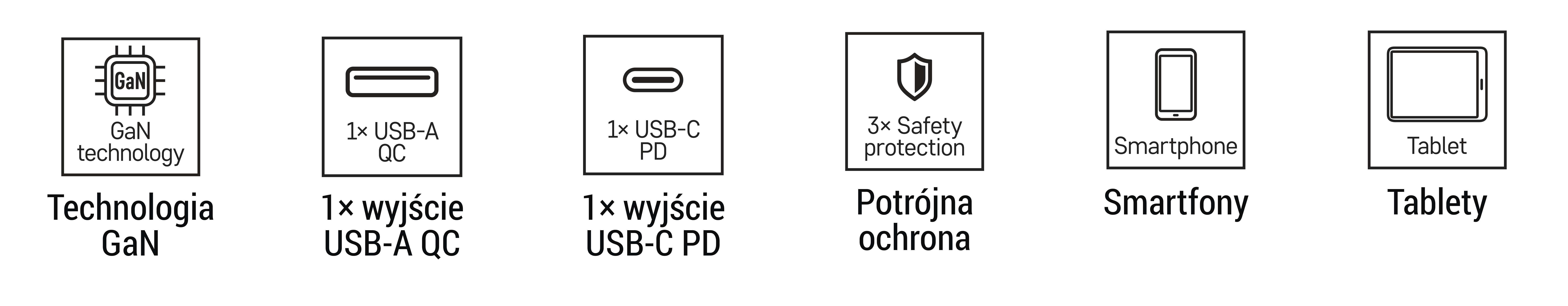 | maks. wyjście 1× USB | A: 5 V/3 A – 9 V/2 A – 12 V/1,5 A (18 W); C: 5 V/3 A – 9 V/2,22 A – 12 V/1,67 A (20 W) |