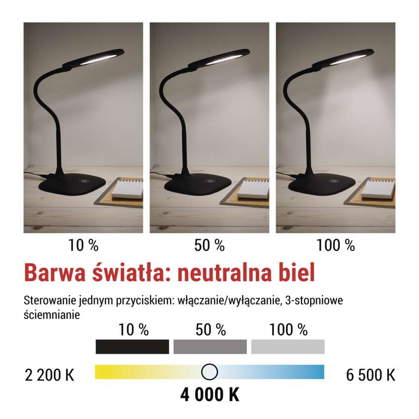 Stylowa i funkcjonalna lampa LED w kolorze czarnym zapewnia doskonałe oświetlenie do pracy, nauki i wieczornego relaksu. Dzięki jasnemu strumieniowi świetlnemu 400 lm, niskiemu zużyciu energii 6,5 W i przyjemnej neutralnej bieli 4000 K tworzy optymalne warunki do koncentracji i odpoczynku.