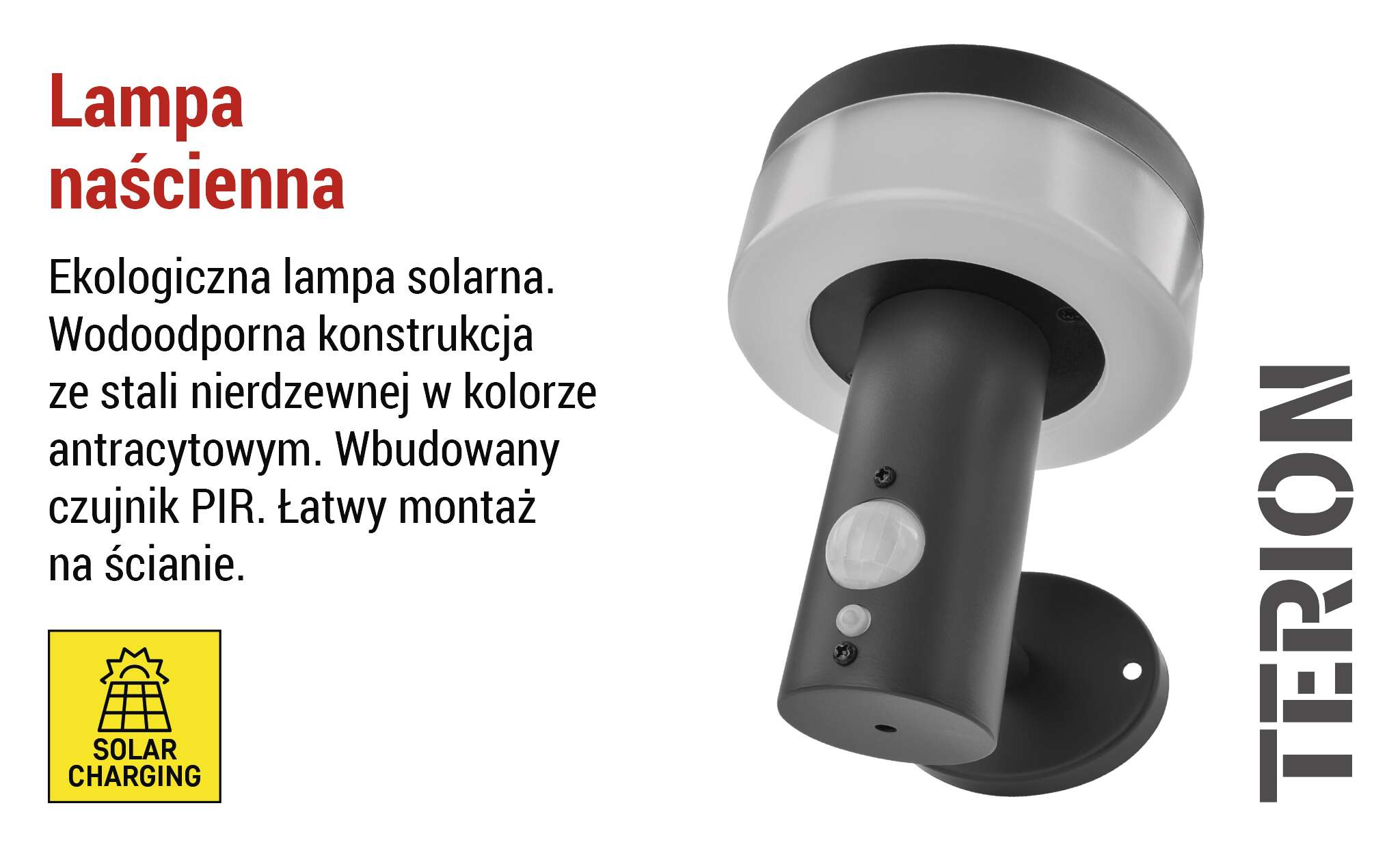 Seria TERION to idealny wybór dla tych, którzy szukają połączenia atrakcyjnego wyglądu i niezawodnej wydajności. Ich nowoczesny design doda wyrazistego charakteru każdej przestrzeni zewnętrznej. W tej serii znajdziesz jedną lampę ścienną i dwa słupki oświetleniowe, wszystkie z wbudowanym czujnikiem PIR. Zapewniają one bezprzewodową pracę bez konieczności podłączania do sieci. Są idealne dla każdego, kto chce mieć pięknie oświetlony ogród z naciskiem na oszczędność i prostotę.