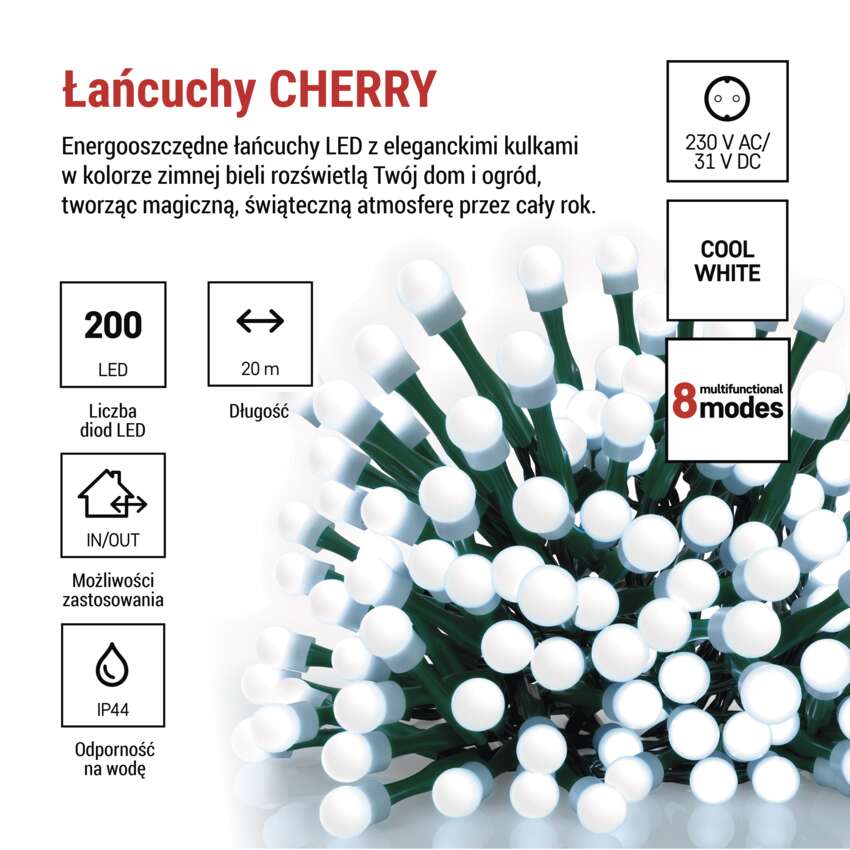 Lampki choinkowe 200 LED cherry 20m , zimna biel, zielony przewód, IP44, 8 programów, time