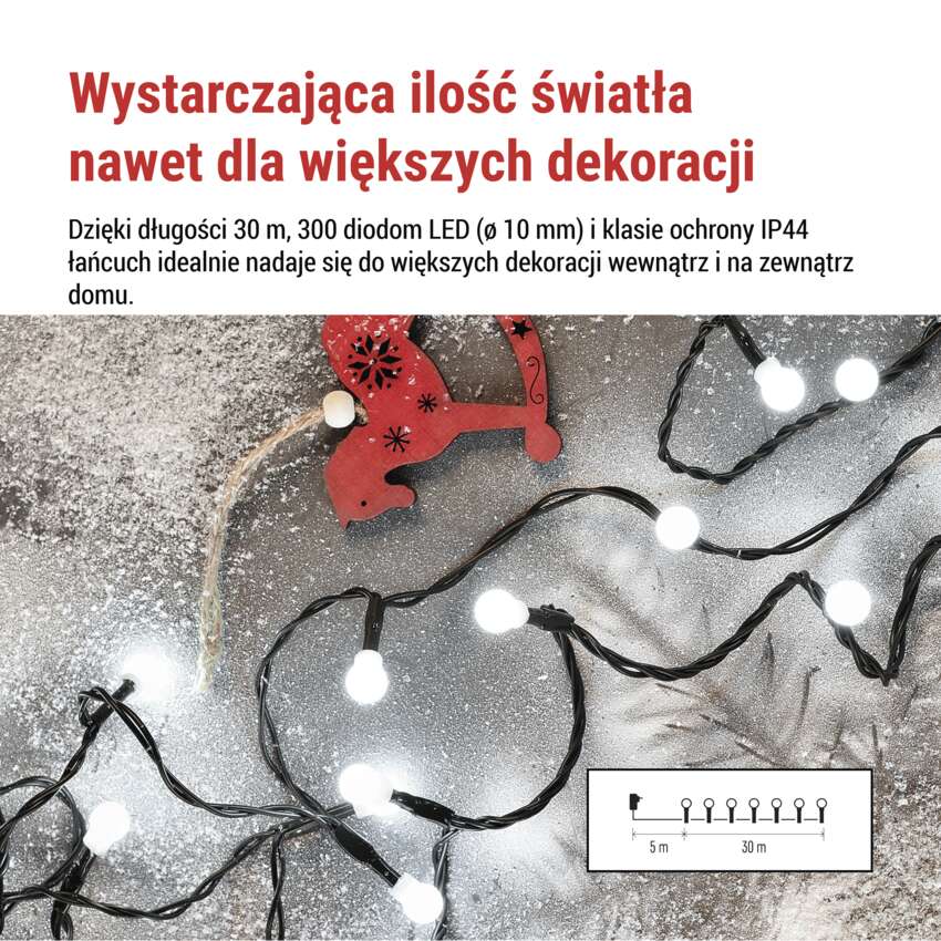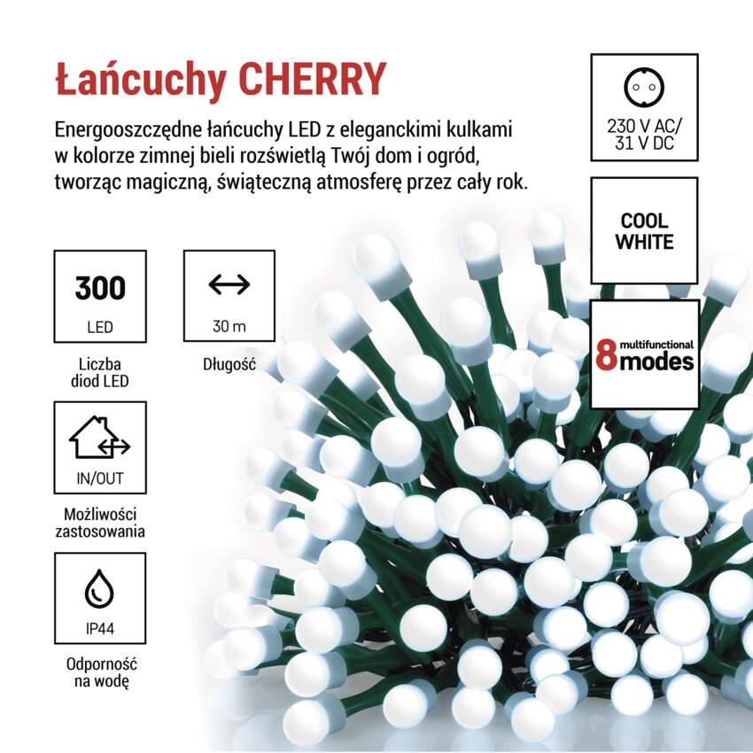 Lampki choinkowe 300 LED cherry 30m , zimna biel, zielony przewód, IP44, 8 programów, time