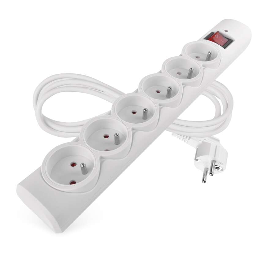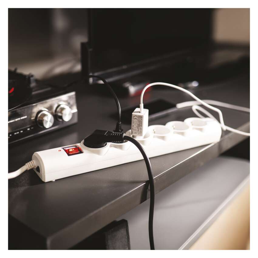Wysokiej jakości ochrona przeciwprzepięciowa z 6 gniazdami, przewodem PVC o długości 1,5 m z żyłą 1,0 mm² i praktycznym wyłącznikiem. Chroni podłączone urządzenia przed przepięciami i skokami napięcia. Maksymalne obciążenie 2300 W (10 A) umożliwia bezpieczne korzystanie z wielu urządzeń jednocześnie w pomieszczeniach wewnętrznych. Wymienny bezpiecznik - łatwe przywrócenie zasilania po przeciążeniu.