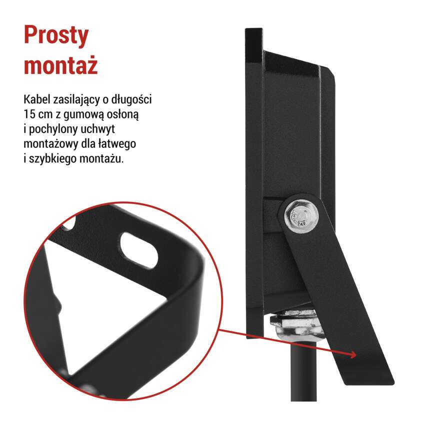 Naświetlacze SIMPO są łatwe do zainstalowania w dwóch krokach. Kątowy uchwyt montażowy umożliwia jego złożenie, aby nie przeszkadzał podczas instalacji. Następnie wystarczy go podłączyć i gotowe.