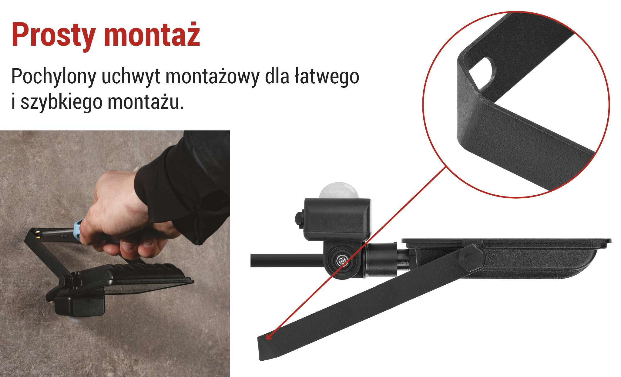 Kątowy uchwyt montażowy umożliwia łatwą regulację kąta i wygodny dostęp do montażu. Po zamontowaniu wystarczy podłączyć go do zasilania - i już można świecić.