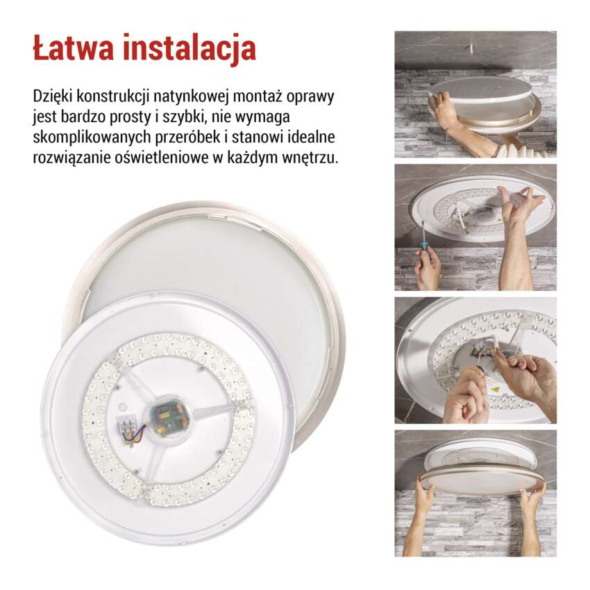 Łatwy montaż oprawy za pomocą standardowych mocowań zapewnia nowoczesne, równomierne i stylowe oświetlenie wnętrza. To rozwiązanie oszczędza czas i energię oraz idealnie nadaje się do nowych i odnowionych przestrzeni.
