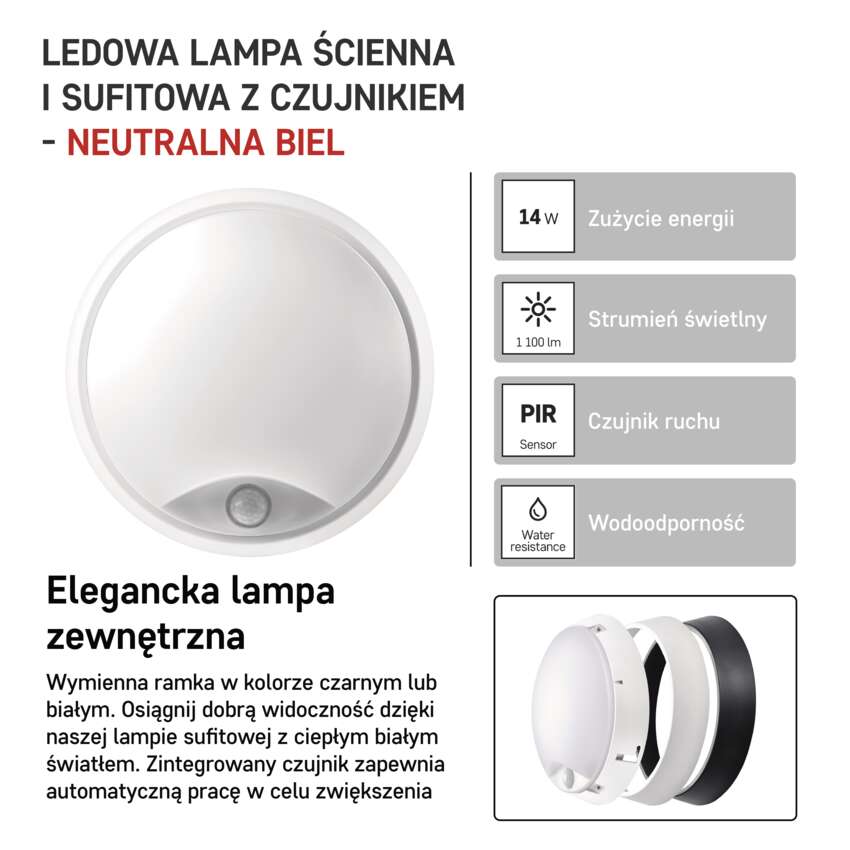 Oprawa LED ZURI okrągła 14W PIR IP54 neutralna biel; biała/czarna