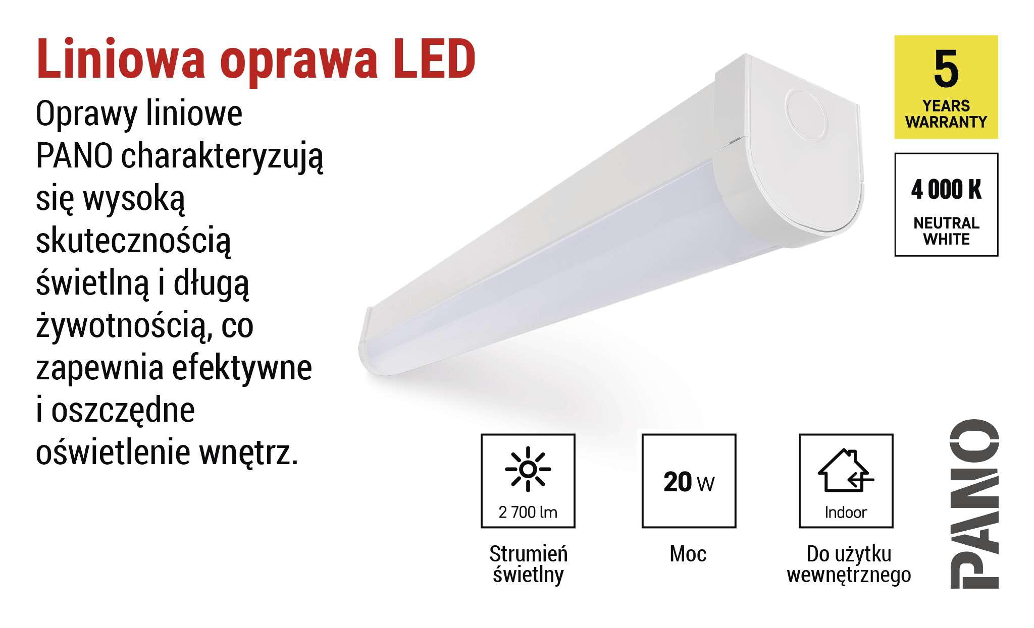 Są idealnym wyborem dla biur, przestrzeni handlowych i środowisk domowych. Oprawy liniowe PANO zostały zaprojektowane z myślą o zapewnieniu niezawodnego i równomiernego oświetlenia, które sprzyja produktywności i komfortowi. Nowoczesny design łatwo integruje się z wnętrzami, a połączenie wysokiej jakości materiałów z precyzyjną konstrukcją zapewnia długą żywotność i bezawaryjną pracę.
