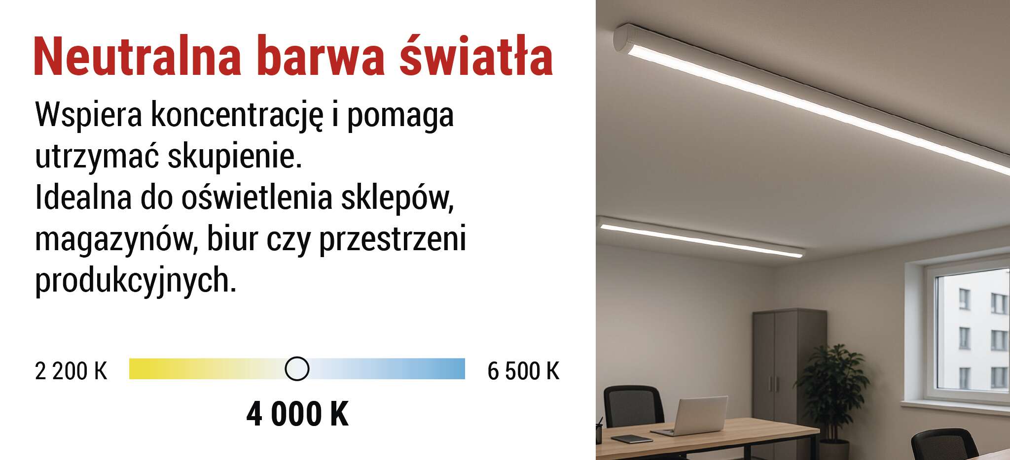 Neutralna barwa światła stwarza idealne warunki do pracy i codziennych czynności. Wygląda naturalnie, nie męczy oczu i pasuje do szerokiej gamy środowisk - od biur i sklepów po obszary przemysłowe. Wszechstronny wybór, który zawsze zachowuje równowagę między wydajnością a komfortem.
