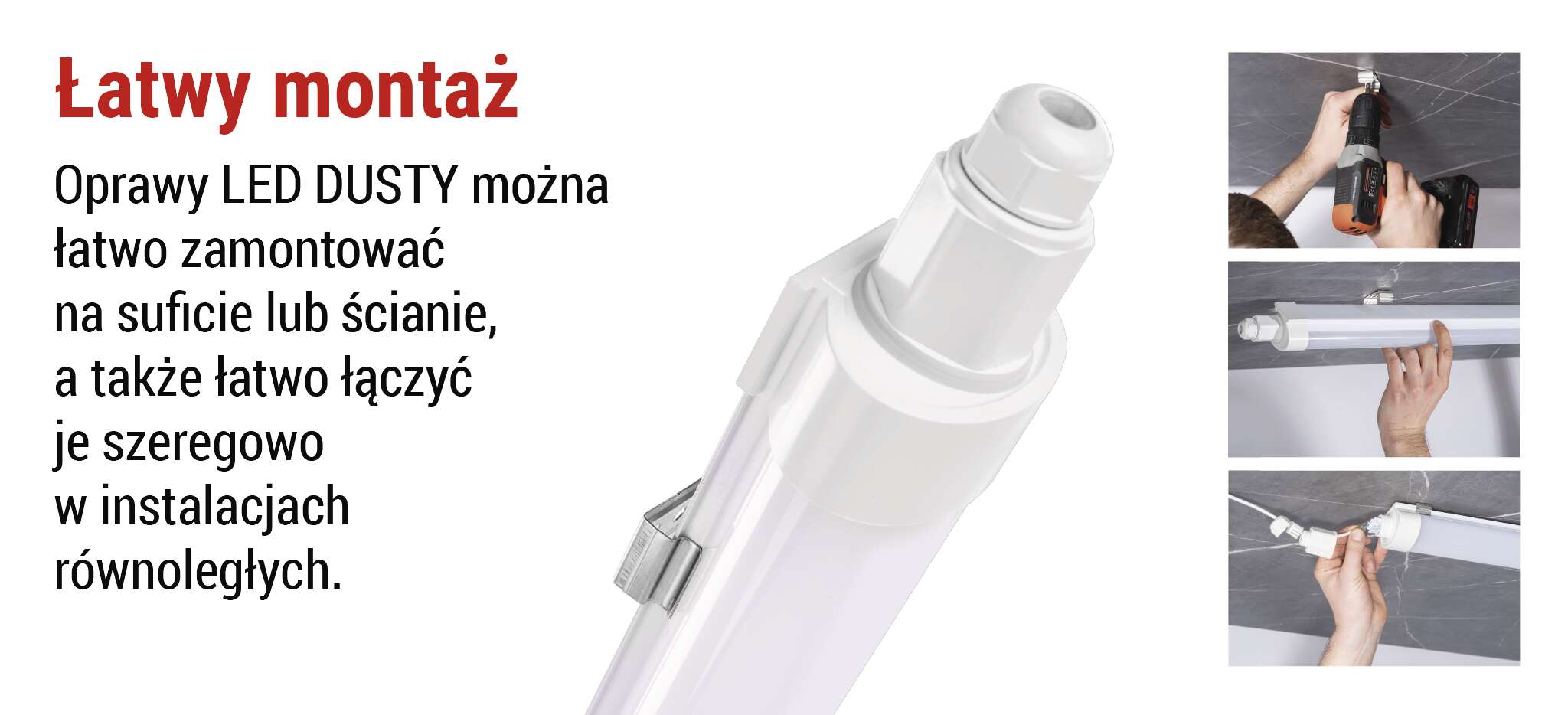 Nasze pyłoszczelne oprawy oświetleniowe myślą nie tylko o wydajności i trwałości, ale także o Tobie. Przemyślana konstrukcja i praktyczne detale sprawiają, że instalacja jest szybka, łatwa i bezproblemowa. Oszczędza to czas i koszty instalacji, bez uszczerbku dla jakości i niezawodności.