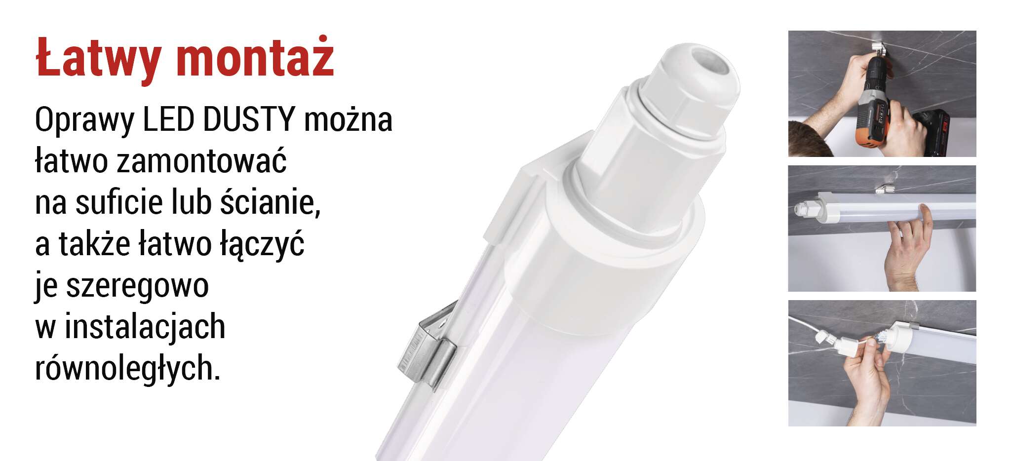 Nasze pyłoszczelne oprawy oświetleniowe myślą nie tylko o wydajności i trwałości, ale także o Tobie. Przemyślana konstrukcja i praktyczne detale sprawiają, że instalacja jest szybka, łatwa i bezproblemowa. Oszczędza to czas i koszty instalacji, bez uszczerbku dla jakości i niezawodności.