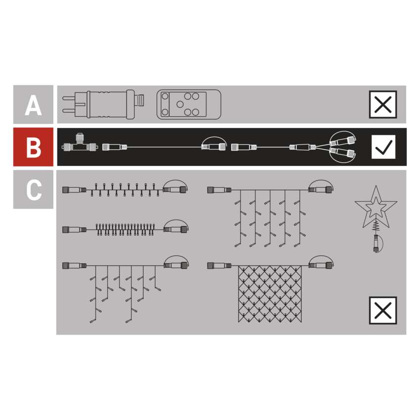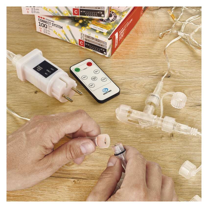 Poszczególne elementy świetlne LED (C) SYSTEMU CONNECT w wersji STANDARD i PROFI można połączyć, połączyć oraz rozgałęzić i udekorować nawet w odległych miejscach za pomocą przedłużaczy i rozgałęźników (B). Dzięki stopniowej rozbudowie o kolejne elementy możliwe jest uzyskanie profesjonalnego i rozległego oświetlenia bez konieczności wysokiej inwestycji początkowej. Połączone ze sobą oświetlenie LED jest więc idealnym wyborem dla spektakularnych dekoracji zewnętrznych, gdzie konwencjonalne długości łańcuchów nie są wystarczające. Każdy może zainstalować system.