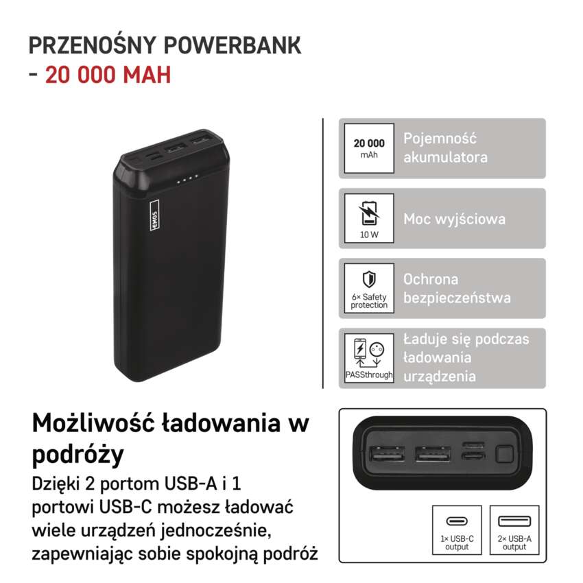 Powerbank EMOS Alpha2 20 oszczędzi Ci niepotrzebnego szoku związanego z martwym telefonem, gdy jesteś poza domem. Dotrze on do Twoich rąk już naładowany, dzięki czemu można natychmiast skorzystać z jego obfitej maksymalnej pojemności 20 000 mAh i 3 wyjść USB do jednoczesnego zasilania 2 urządzeń. Dodatkowo, dla Twojego spokoju ducha, jest on stale chroniony przez 6 inteligentnych funkcji bezpieczeństwa, które nie pozwolą na narażenie go lub Twojej elektroniki. Mimo to, nie jest to monstrualna ładowarka zewnętrzna, lecz sprzęt kieszonkowych rozmiarów, przetrwa niechciane upadki dzięki ochronnej tarczy wykonanej z wysokiej jakości utwardzonego tworzywa ABS. W zestawie znajduje się szybki kabel USB-C, którym oprócz zasilania można przesyłać dane.
