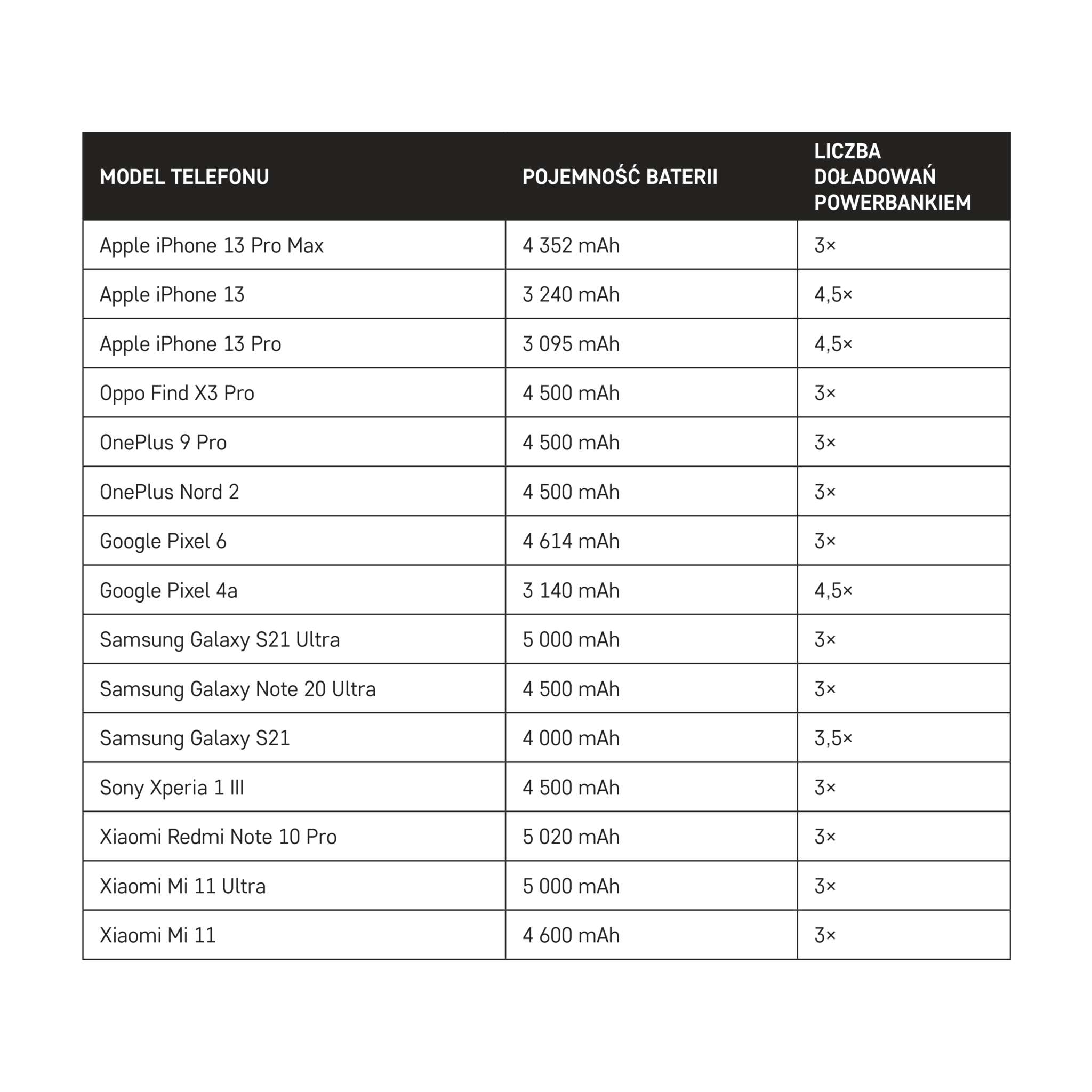 Więc ile razy realnie ten powerbank naładuje Twojego iPhone'a, inny telefon komórkowy, tablet lub iPad, spójrz na tabele, w których wymieniamy obecnie najlepiej sprzedające się modele.