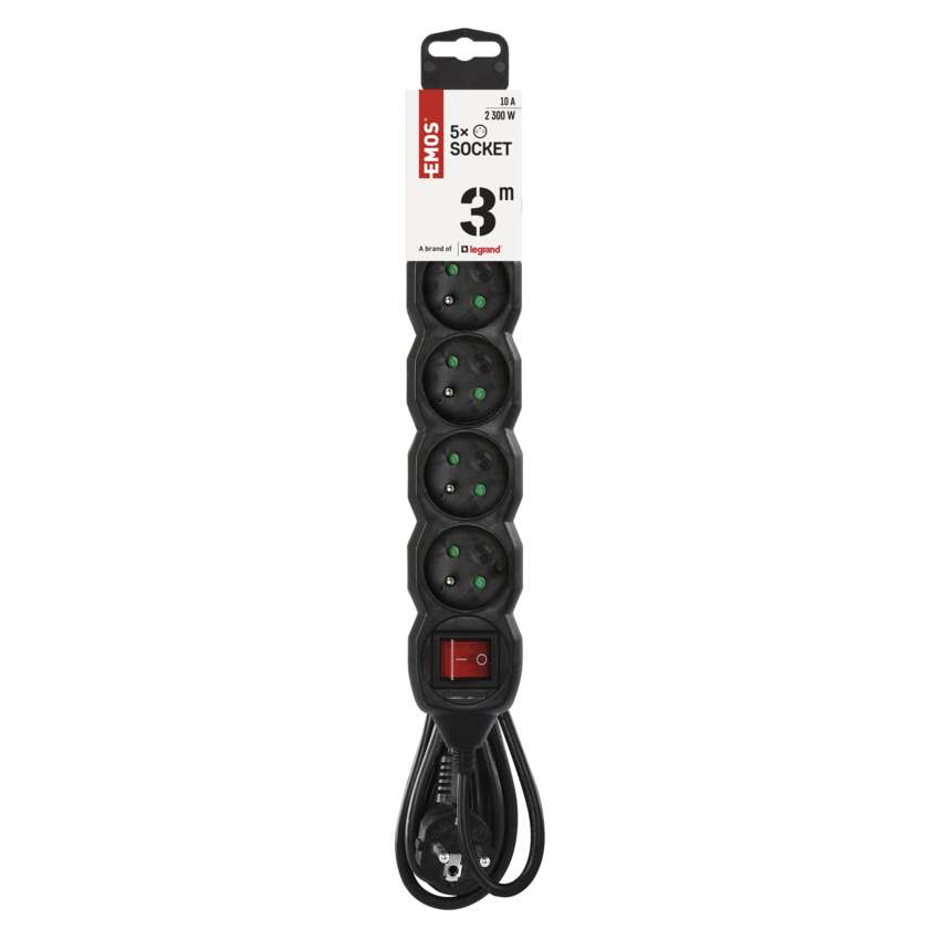 Przedłużacz 3 m / 5 gniazd / z wyłącznikiem / czarny / PVC / 1 mm2