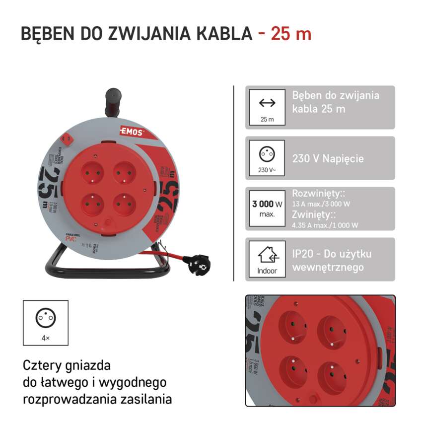 Przewód o długości 25 m z wysokiej jakości osłoną zewnętrzną z PVC i żyłami o przekroju 1,5 mm² sprawia, że idealnie nadaje się do pracy w pomieszczeniach. Obrotowy bęben sprawia, że praca z nim jest wygodna, szybka i łatwa.